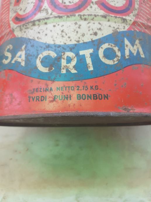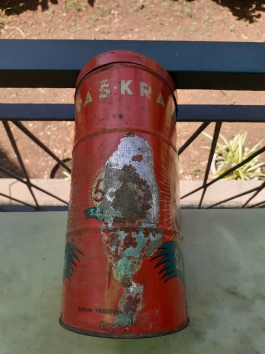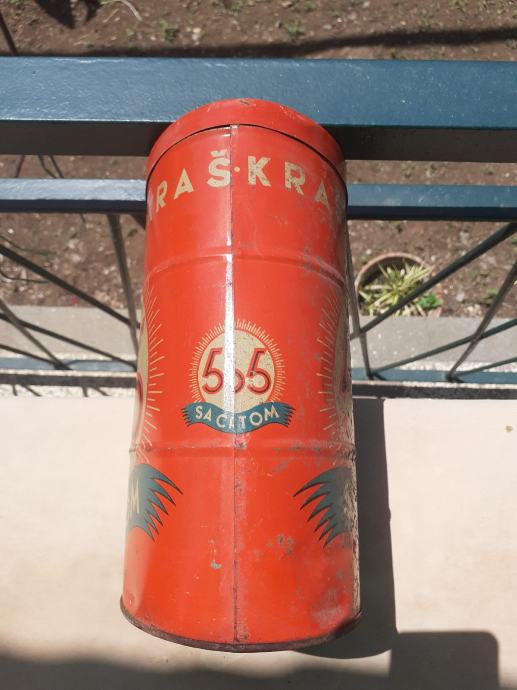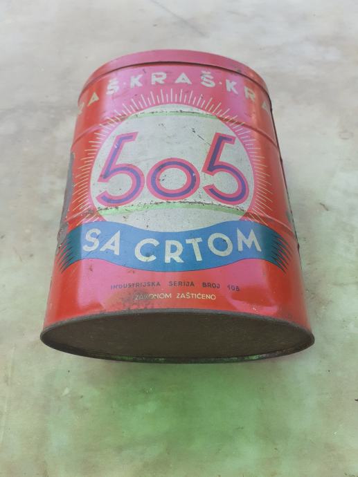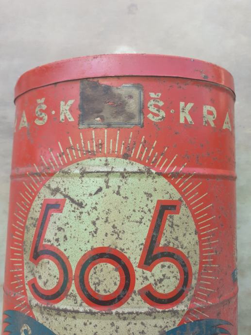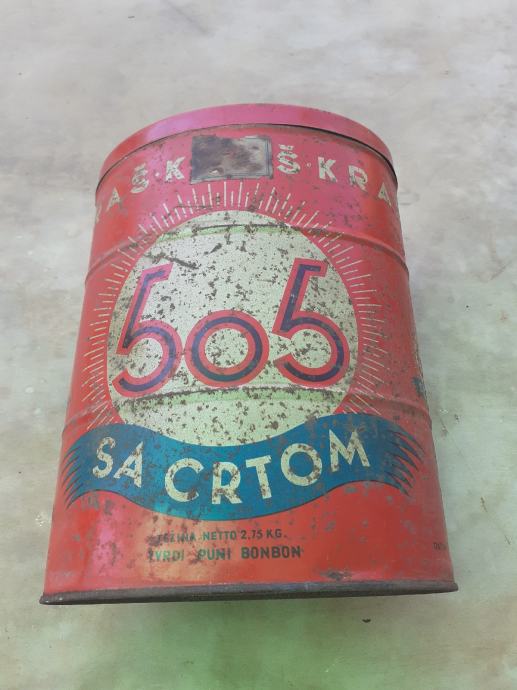 Prodaje se velika limena kutija Kraš 505 sa crtom visine cca 22,5 cm, dužine cca 17 cm i širine cca 11 cm. Kutija ima oštećenja u vidu tragova korozije, sa bočne strane ima veću oguljotinu slike, te oštećenu naljepnicu pri vrhu. Cijena limene kutije je 67 eura. Mogućnost osobnog preuzimanja u Zadru. Kontakt broj mobitela 091 131 10 36.