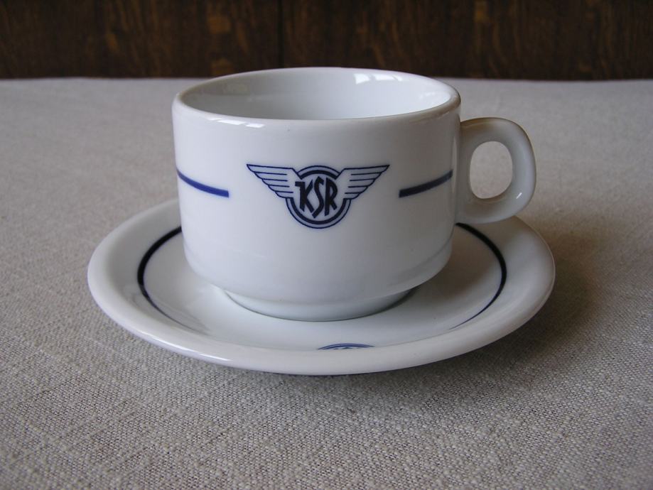 Velika šalica za čaj ili kavu sa pripadajućim tanjurićem. Iz 1980ih, sa oznakom "KSR" - Kola za spavanje i ručavanje koja su bila sastavni dio tadašnjih vlakova Jugoslavenske željeznice. I tanjurić i šalica su malo oštećeni sa stražnje strane na postolju (zadnje 2 slike), s prednje strane nema oštećenja.Oboje je izradila bivša Jugokeramika Zaprešić.