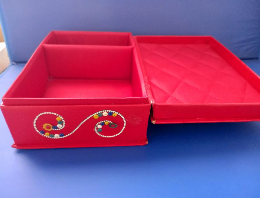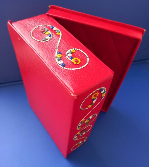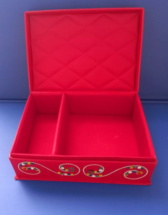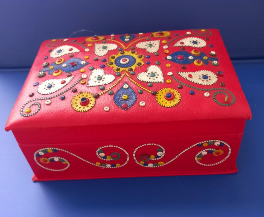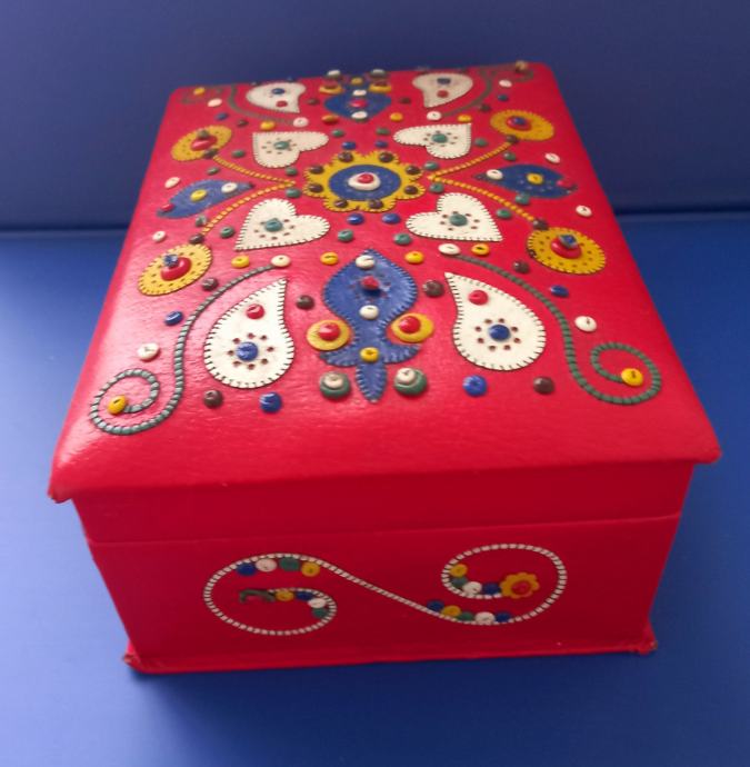 Velika stara kutija raskošnog izgleda obložena skajom , bogato ukrašena etno motivima te lijepo futritana iznutra,dobro očuvana