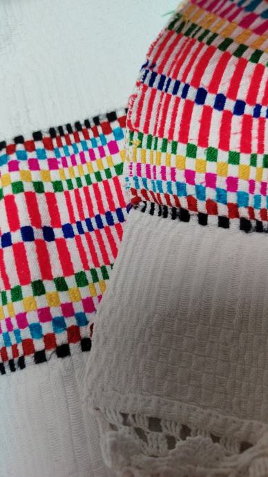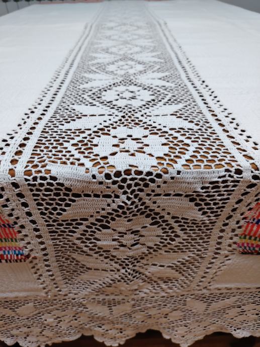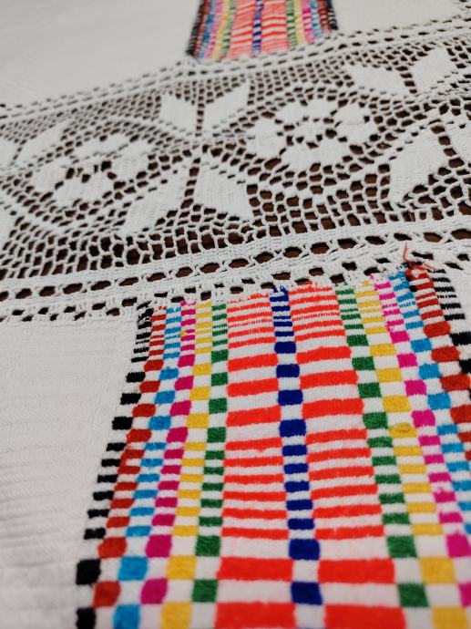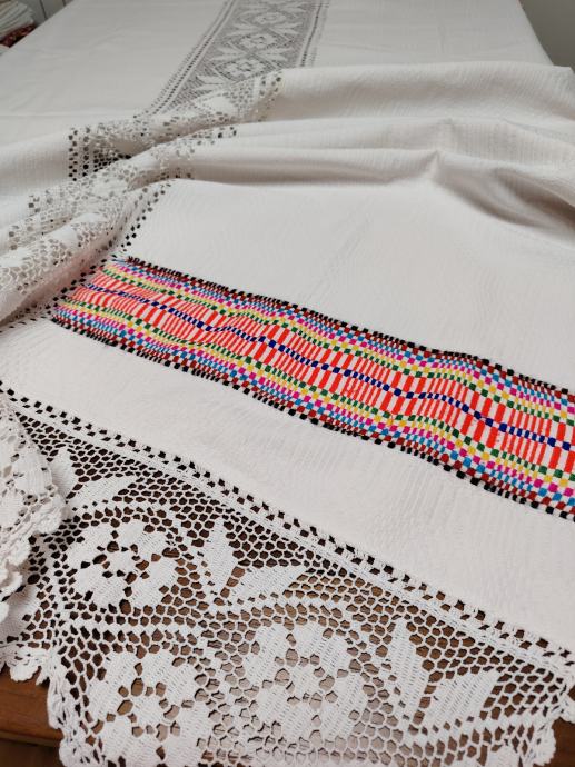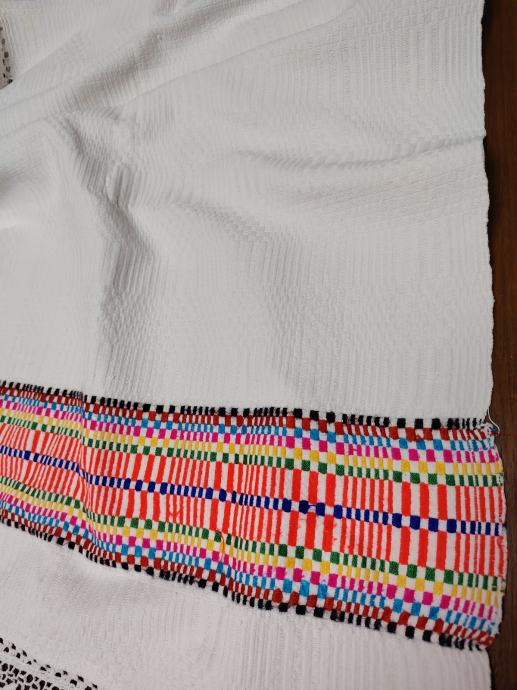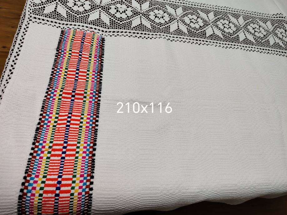 Jako dobro očuvan, kao nov.Veličina 210x116.Deblje tkano borano platno sa šarenim vezom i heklanim ukrasima.