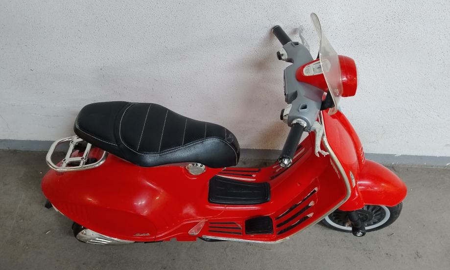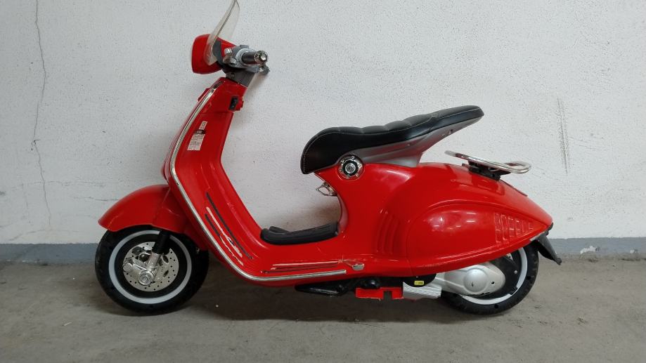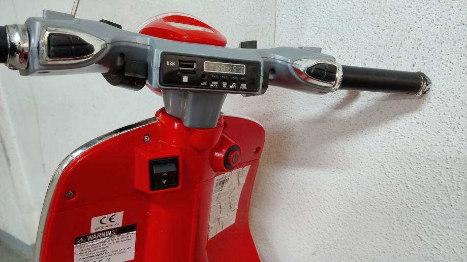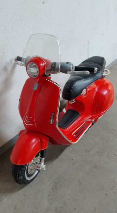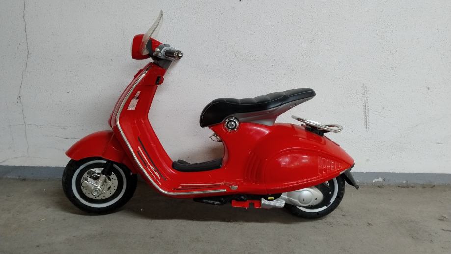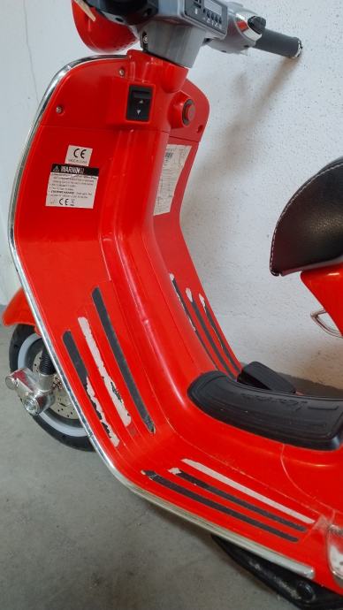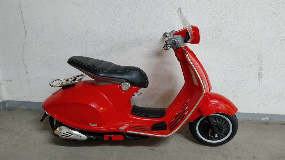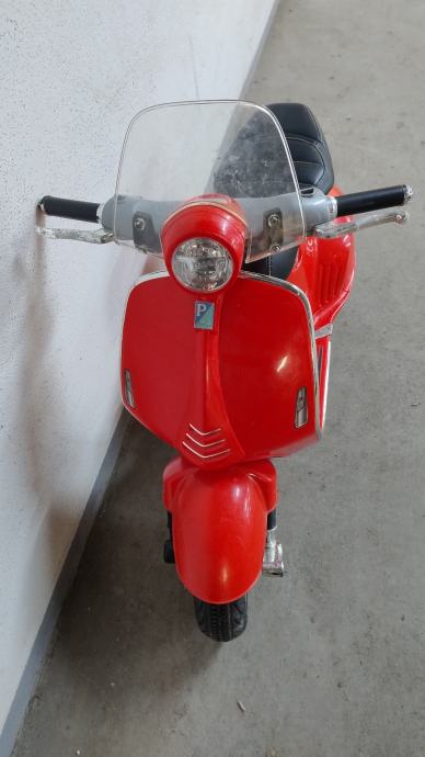 Vespa na baterije za djecu. Uz cestu ide punjač na struju. U funkciji, vozi, pale se i gase svjetla, zvučni signali, glazba. Stanje: uredno. Nedostaci: nedostaje nogari za samostalno stajanje, te plastika na desnom kvačilu malo oštećena, ostalo sve u solidnom stanju .