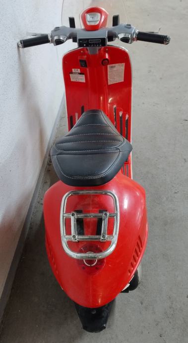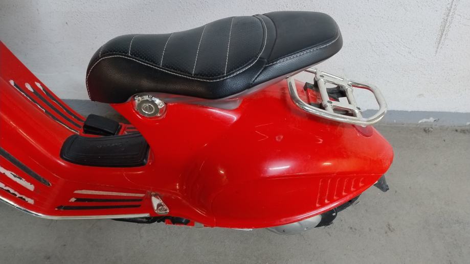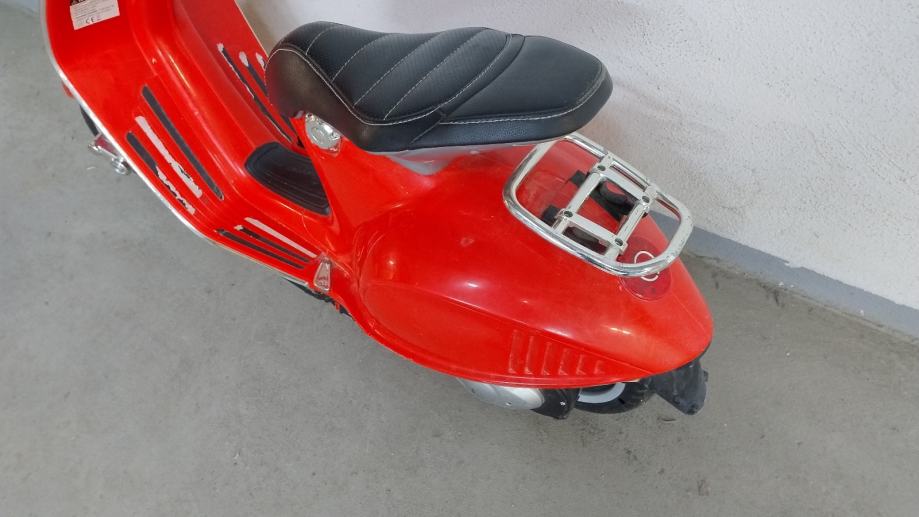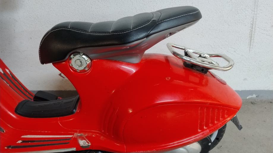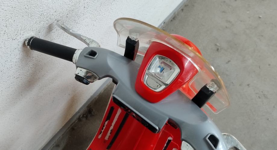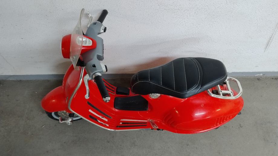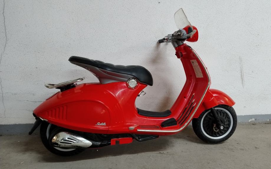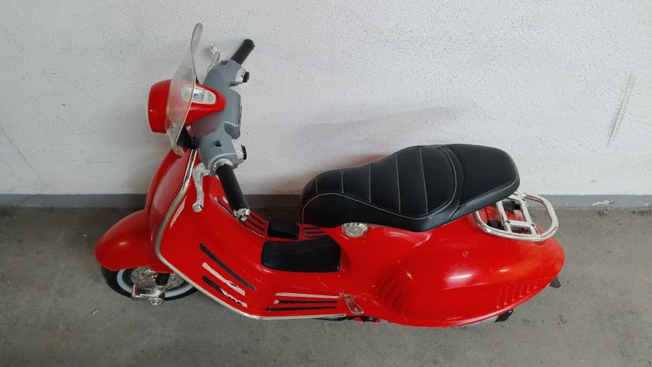 Vespa na baterije za djecu. Uz cestu ide punjač na struju. U funkciji, vozi, pale se i gase svjetla, zvučni signali, glazba. Stanje: uredno. Nedostaci: nedostaje nogari za samostalno stajanje, te plastika na desnom kvačilu malo oštećena, ostalo sve u solidnom stanju .