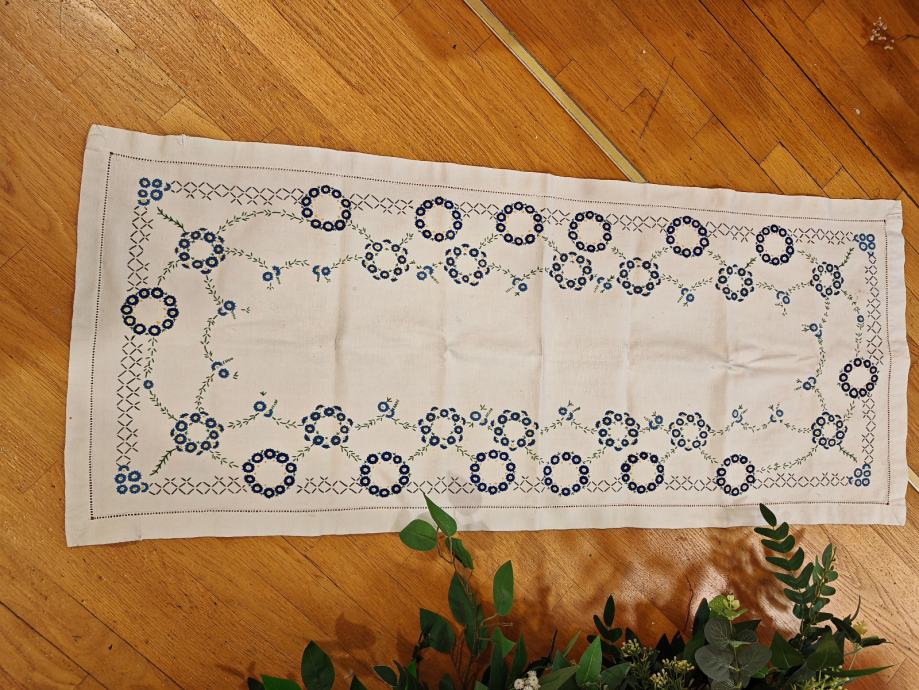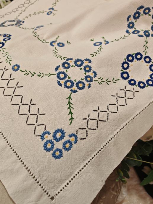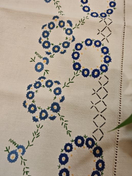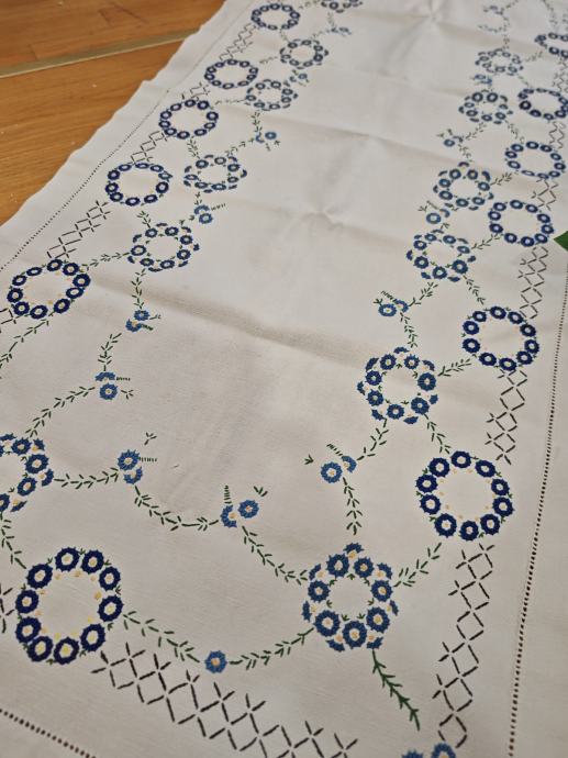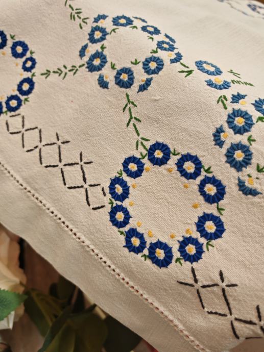 Predivan vezeni stolnjak - nadstolnjak sa plavim cvijetpvima. Dimenzije zihe 120x 50 cm.