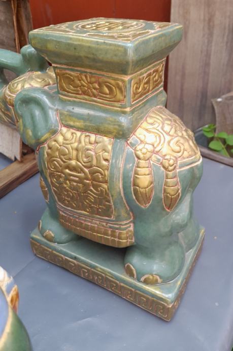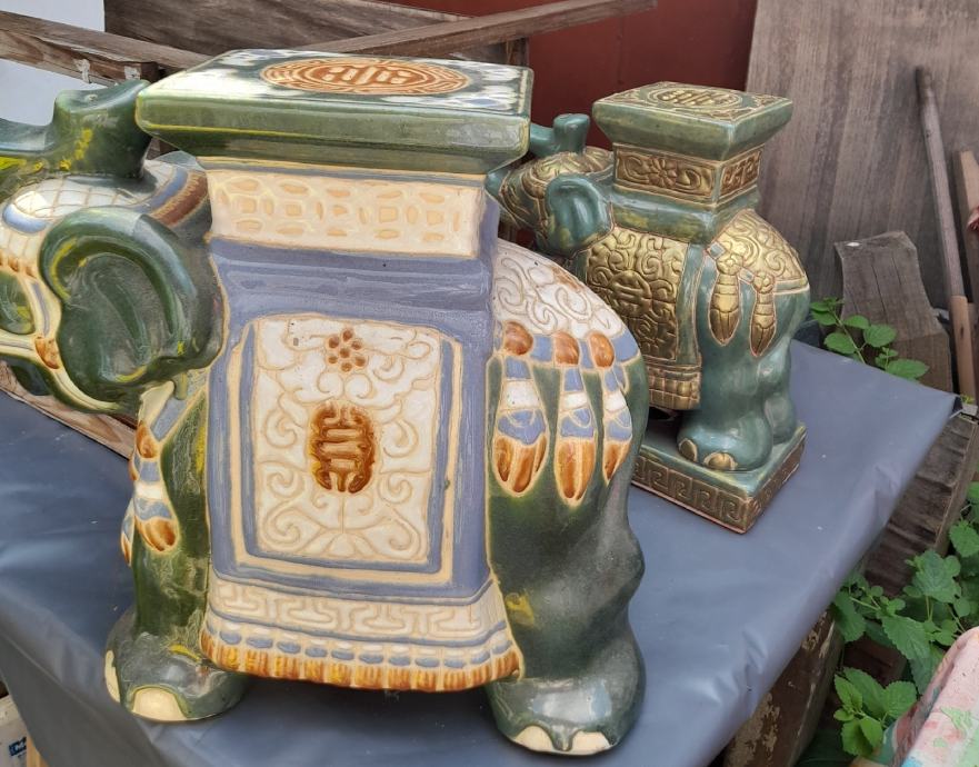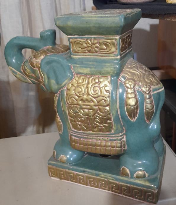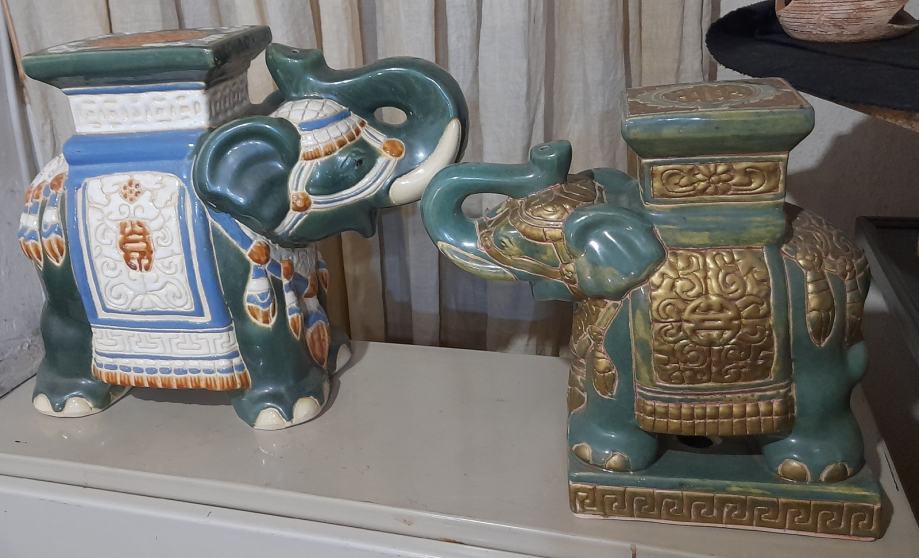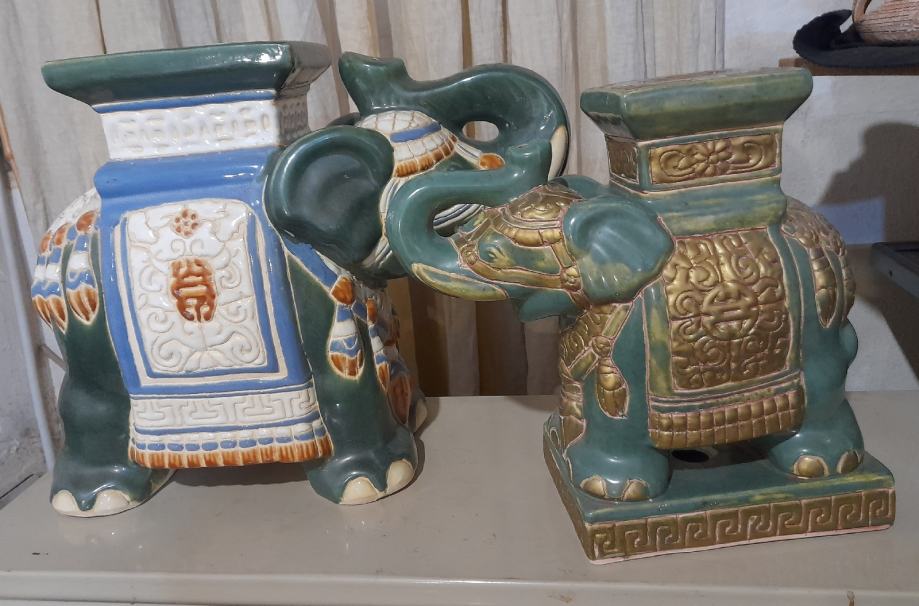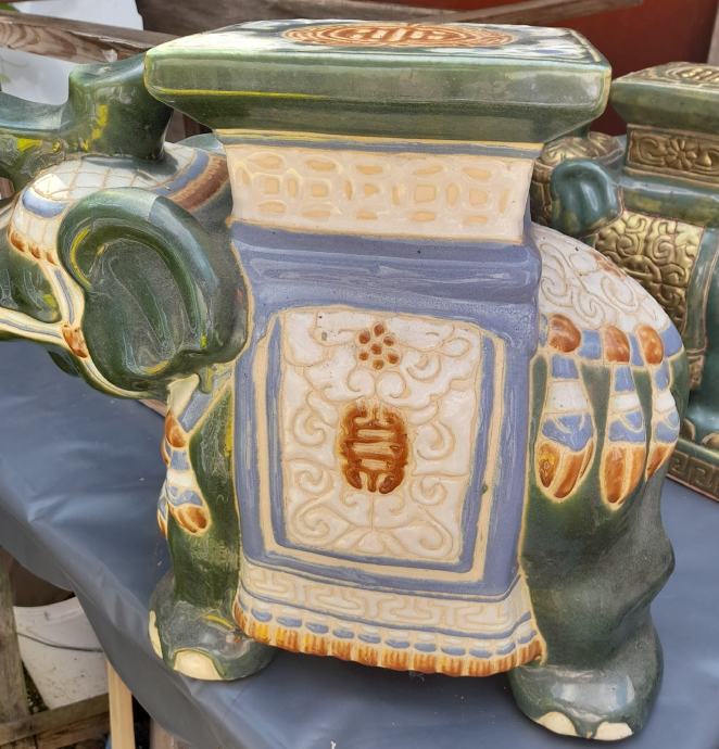 Ljepa 2 slona jedan veci drugi manji.Glazura i pozlata.Na njima se moze sjediti,ljep su stalak za biljke ili sto vec.Neosteceni.Manji 30 32cm.Svaki posebno za 80 eura.Oba 150 eura.