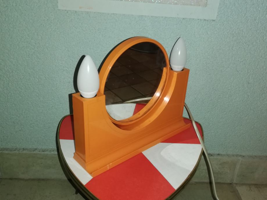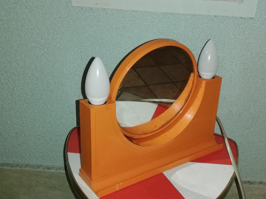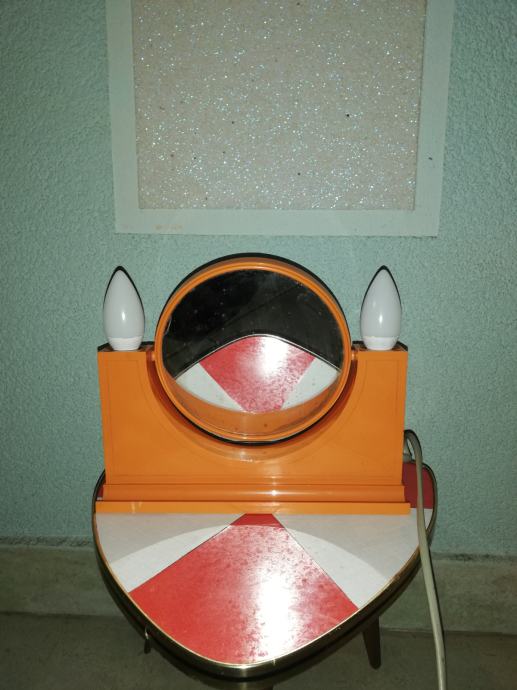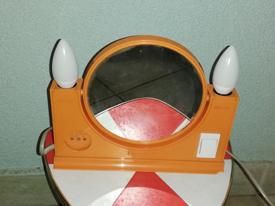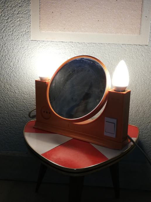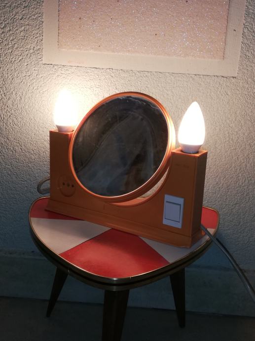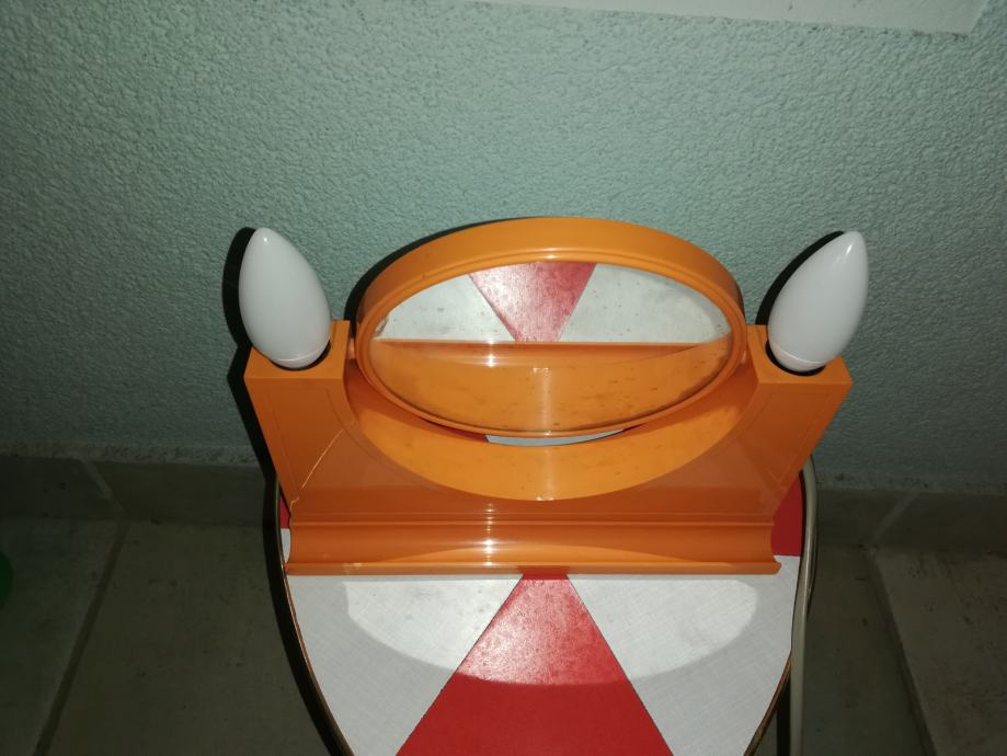 Vintage predmet 4 u 1: dvostruko ogledalo (normalno, uvećani), dvostruka svjetiljka, prostor za odlaganje, utičnica za ostala trošila: primjerice fen. Materijal : tvrda plastika u narančastoj boji. U stilu space age.