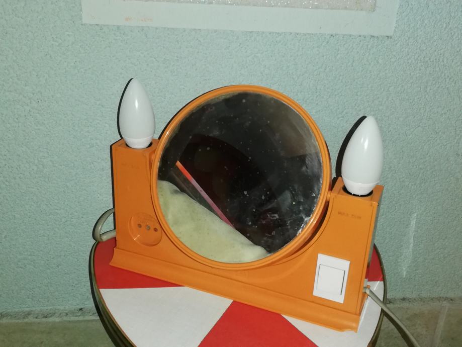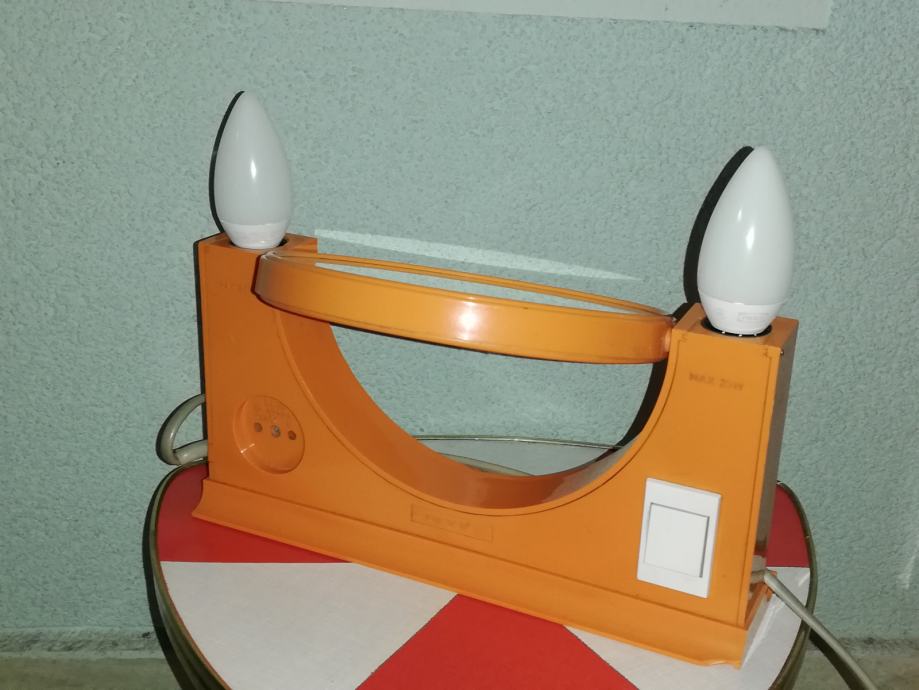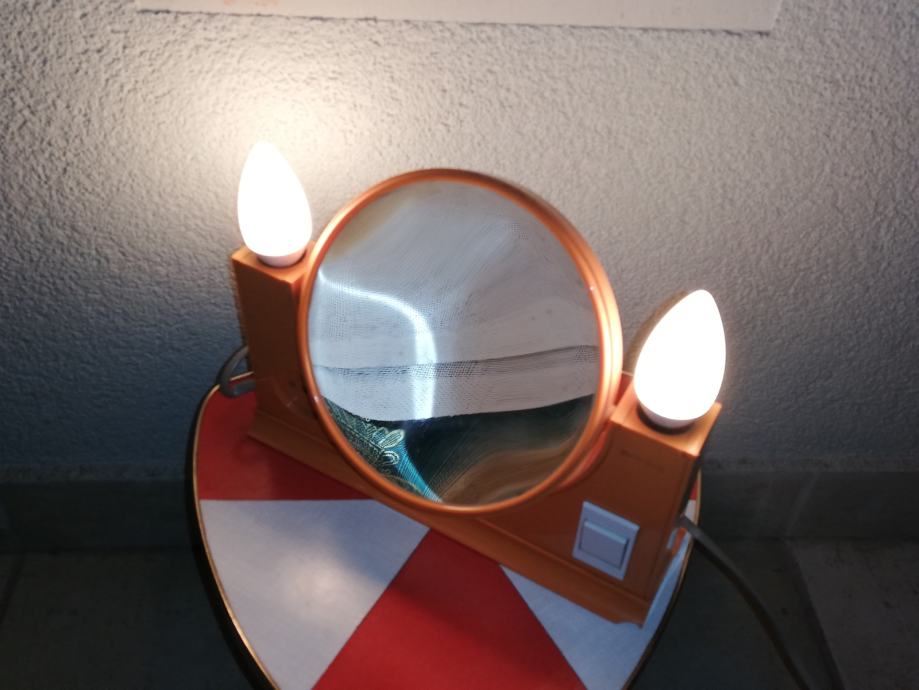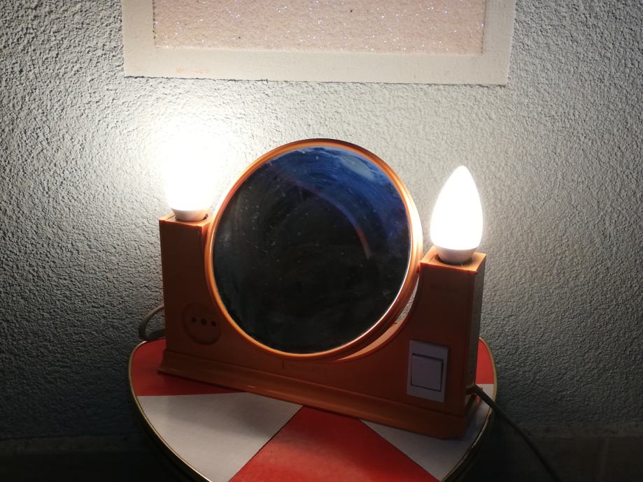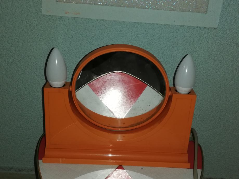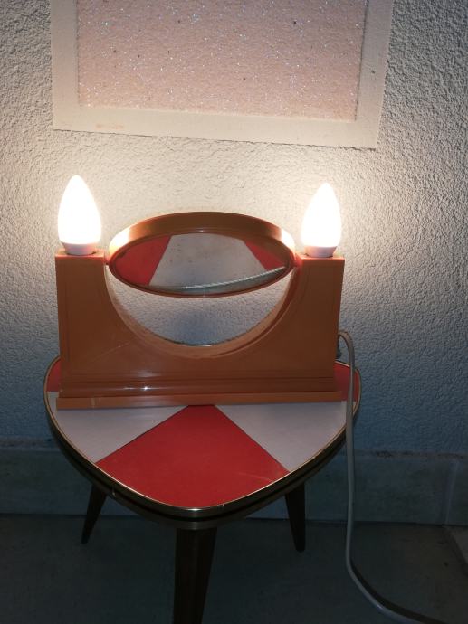 Vintage predmet 4 u 1: dvostruko ogledalo (normalno, uvećani), dvostruka svjetiljka, prostor za odlaganje, utičnica za ostala trošila: primjerice fen. Materijal : tvrda plastika u narančastoj boji. U stilu space age.