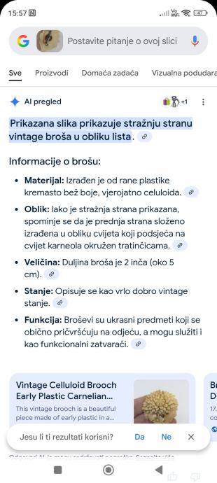Stari Bros dugacak 5 centimetara sa poprečnom iglom na poleđini,a Bros je u obliku lista,smede boje.Za sve informacije nazovite na broj dolje upisan ili upit na Viber ili Njuskalo, a Šaljem Poštom ili Tiskom ili u dogovoru sa kupcem.VIDI SLIKE!!
