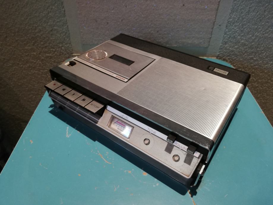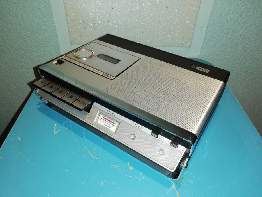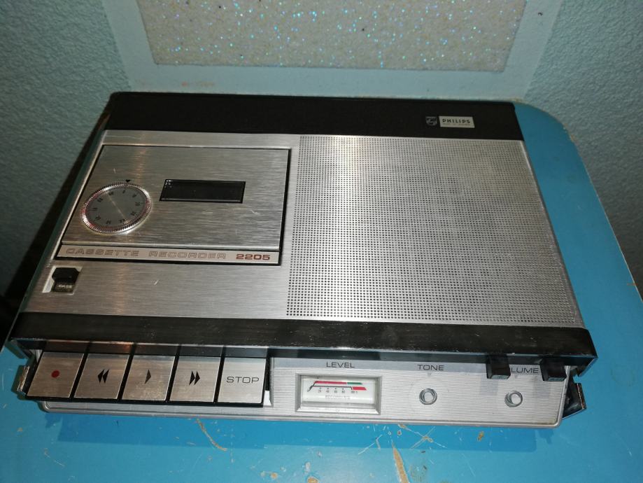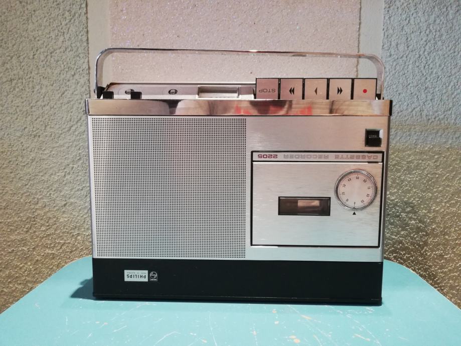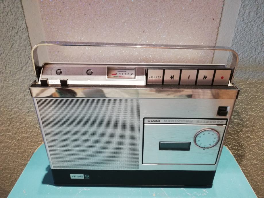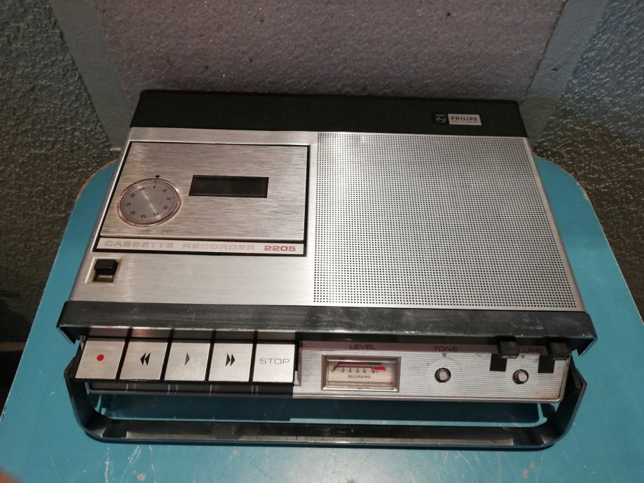 Vintage Cassette recorder Philips 2205 iz 1968.g., proizvođač Philips, Austrija. Vrsta napajanja i napon:110/220 /Baterije 6 x 1,5 volti. Dimenzije (WHD) 253 x 190 x 65 mm,
