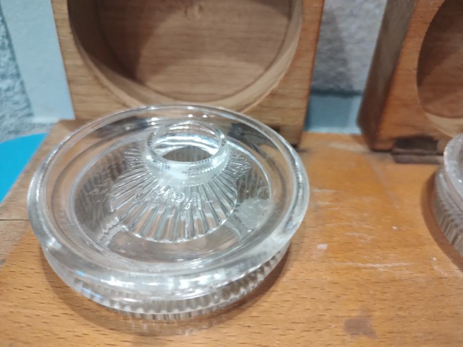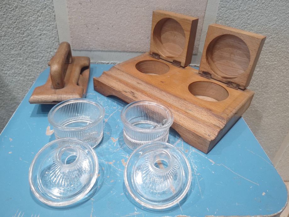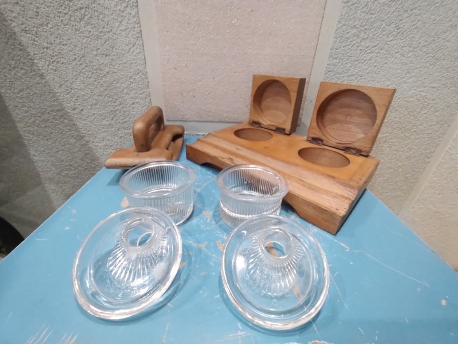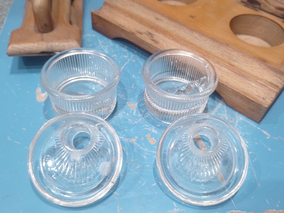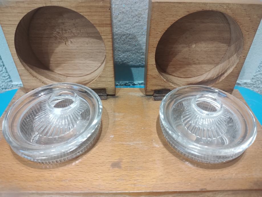 Stanje: u odličnom stanju, sačuvano, drvo treba je osvježiti, stakle posudice da poklopcima u besprijekorno sačuvanom stanju, ( obično su napuknute ili oštećene).