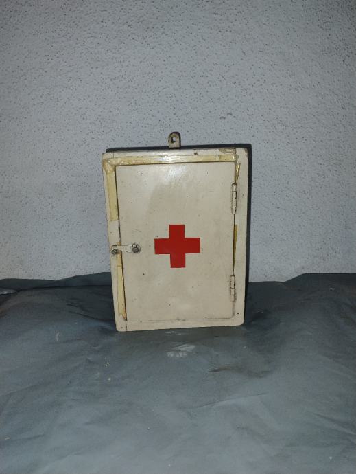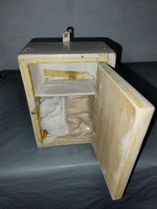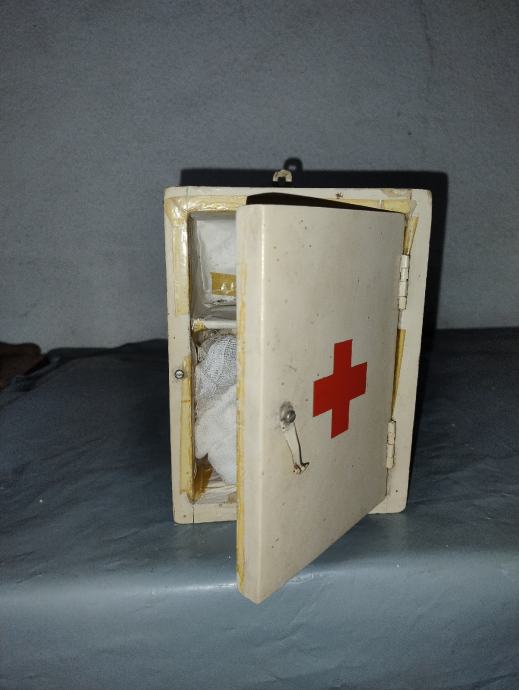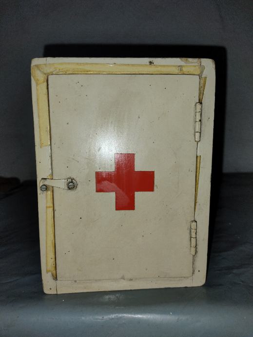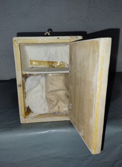 Mini vintage drveni ormarić prve pomoći .U funkciji, sačuvano.