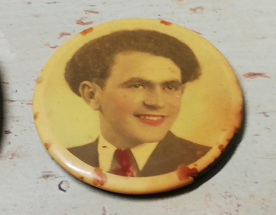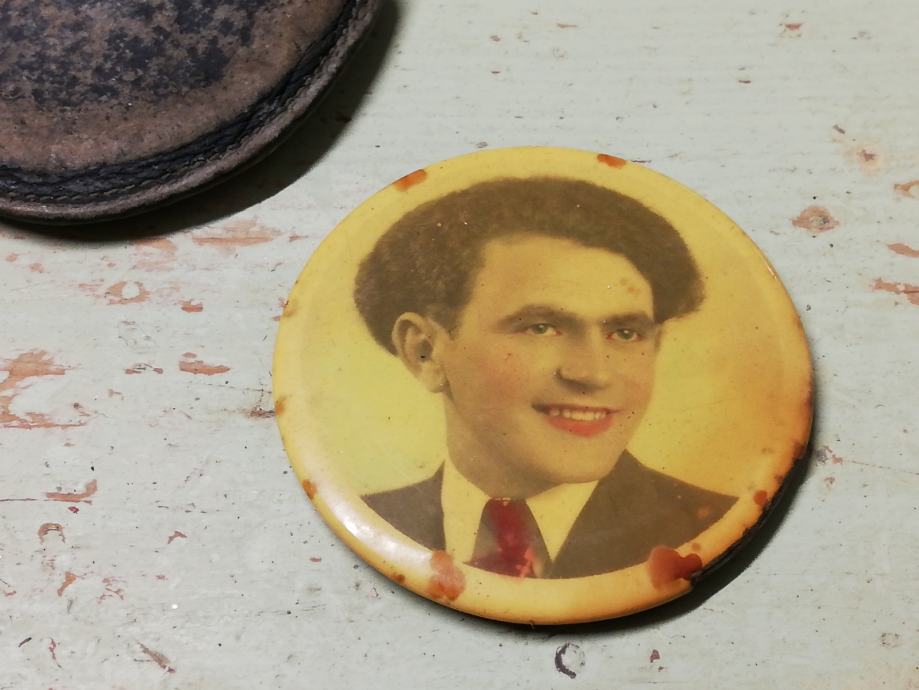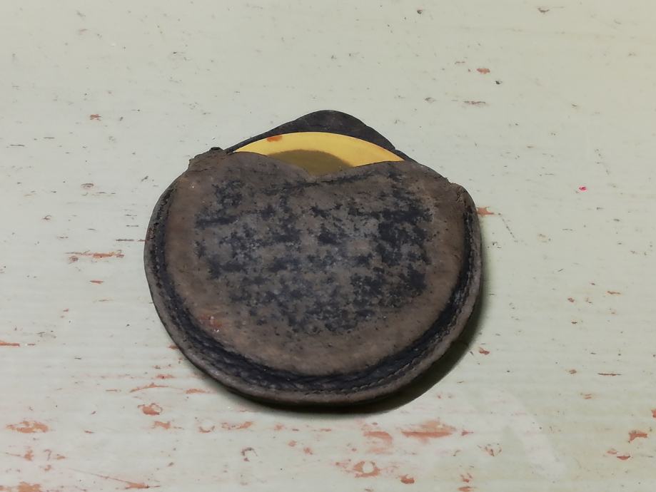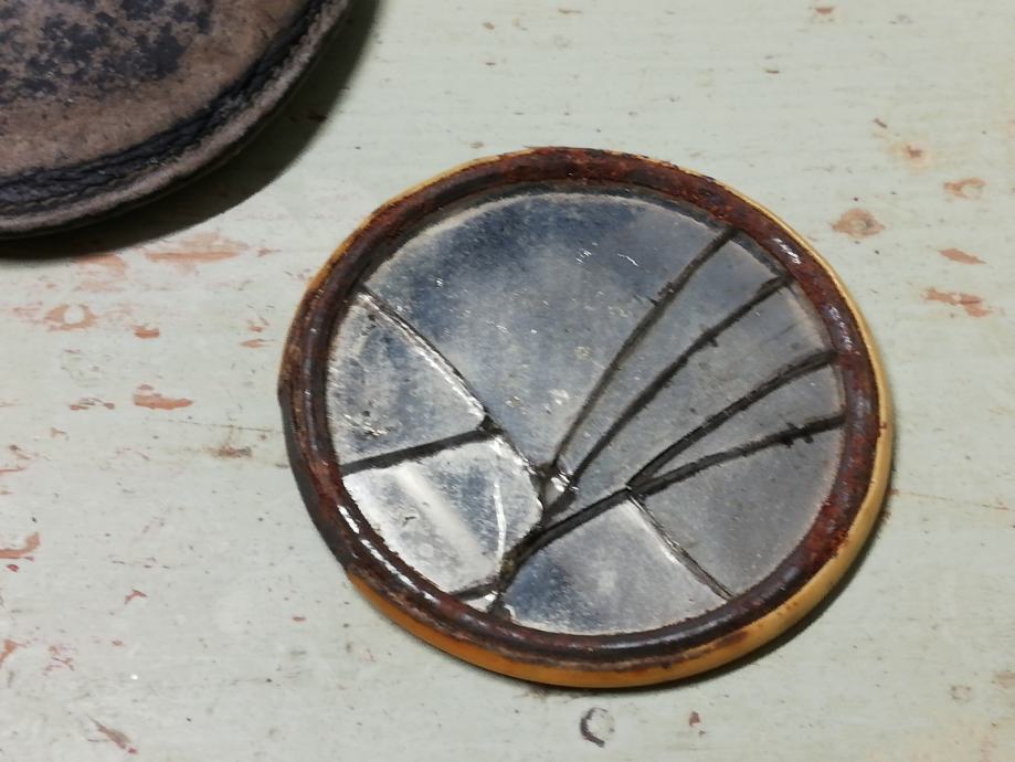 Vintage džepno ogledalo u kožnoj futroli iz 1950.g., nepoznata osoba na poleđini zrcala. Zrcalo slomljeno.