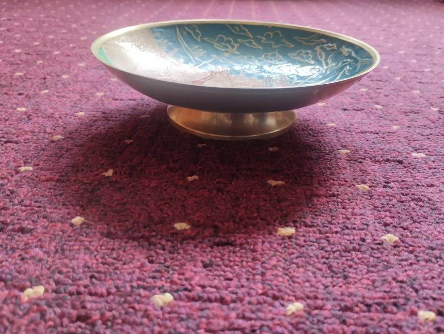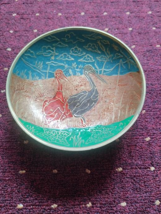 Vintage emajlirana ukrasna zdjela od punog mesinga promjera 18cm, visina 5cm. Motiv rode