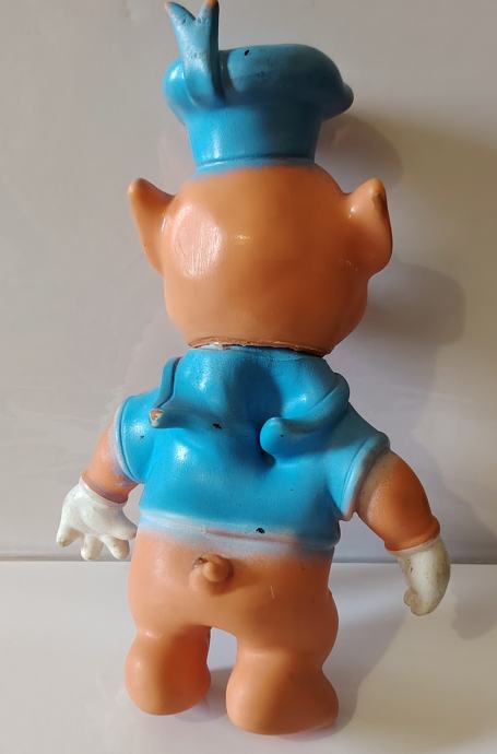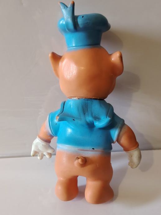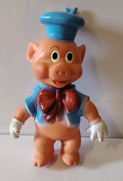 Prodajem staru gumenu igračku praščića s plavim šeširom i crvenom mašnom. Igračka je vjerojatno proizvedena 60-ih ili 70-ih godina.