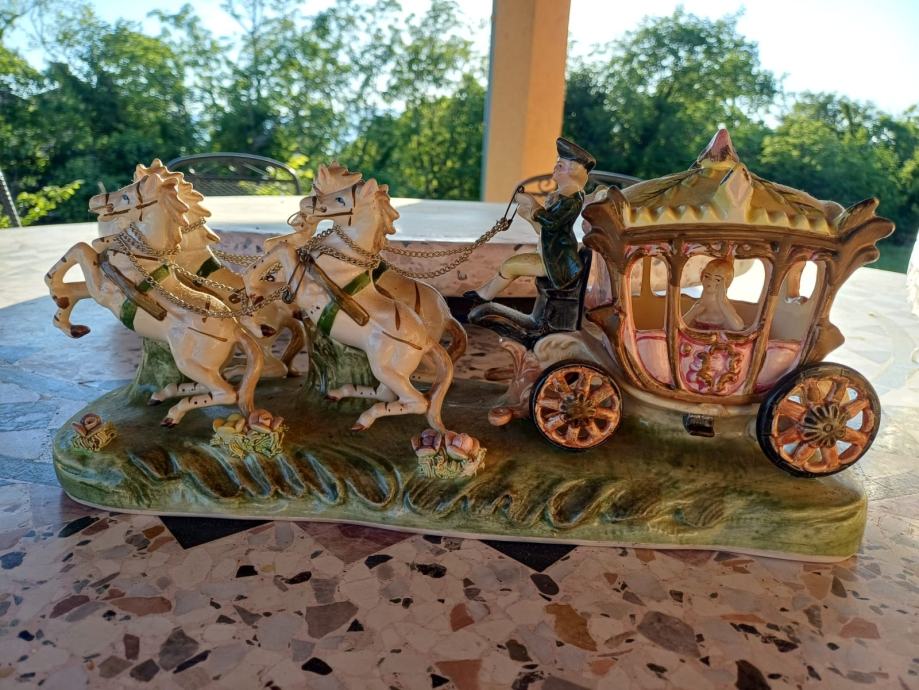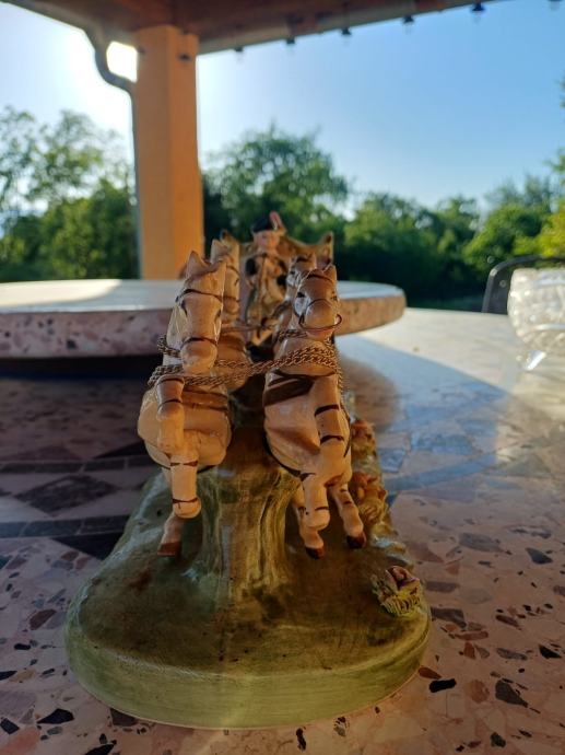 Veći ukrasni komad s četiri konja, kočijom, vozačem, putnicom i metalnim lančićima. Vrlo dekorativno za vitrinu, klasično/retro uređenje, apartman, konobu ili kolekciju.
