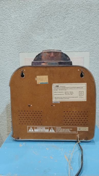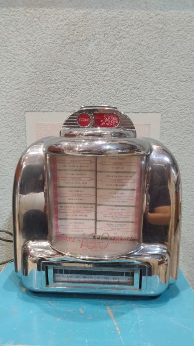 Vintage kolekcionarsko izdanje radio-kazetofona Model CR9. Radio/kazetofon Jukebox Model (Würlitzer wallbox) u solidnom stanju. Nedostatak: nedostaje plastika sa brojevima i slovima, te ulaz kasetofona . Klasična kolekcija CR9. Proizvodni kod Y - serijski broj 03038. Vrlo poseban artikl. Radio ima dvije frekvencije: AM i FM, radi na 220V i 50Hz. Sa strane u ovaj "jukebox" možete staviti kasetu, pustiti/premotati kasetu. Stavite kasetu i vrpca će se reproducirati. Reproducira, ali vrti (pre)sporo. Svjetla se pale kada je player uključen (preko gumba za glasnoću), na vrhu se može okrenuti kartica za odabir pjesama. Jedinica se također može objesiti s dvije kuke na stražnjoj strani. Dimenzije: visina 34 cm širina 31 cm dubina 17 cm težina cca. 2,5 kg.
