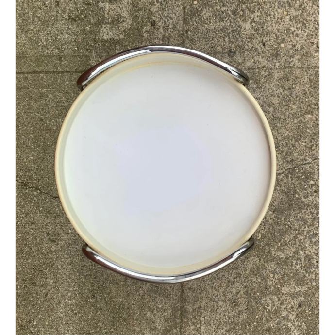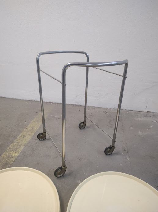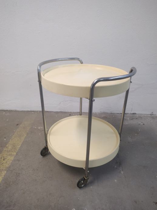 Vintage okrugla barska pokretna kolica u stilu space age od bijele krem plastike i metala u kromiranoj boji iz sredine stoljeća. Izrađena u Italiji 1950-ih. Ovaj predmet je u vrlo dobrom vintage stanju i ima dvije okrugle plastične police, kromiranu metalnu konstrukciju i četiri funkcionalna i fina kotačića.