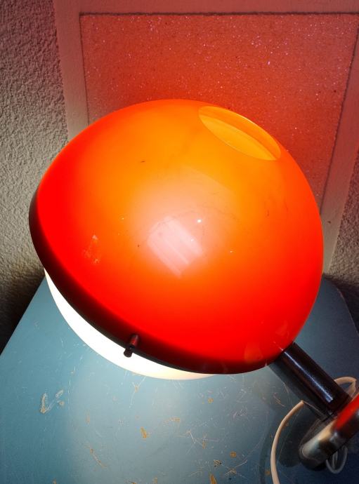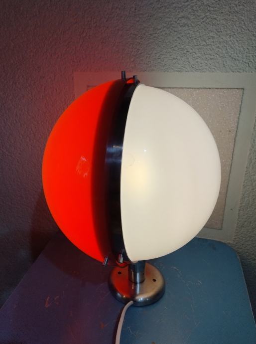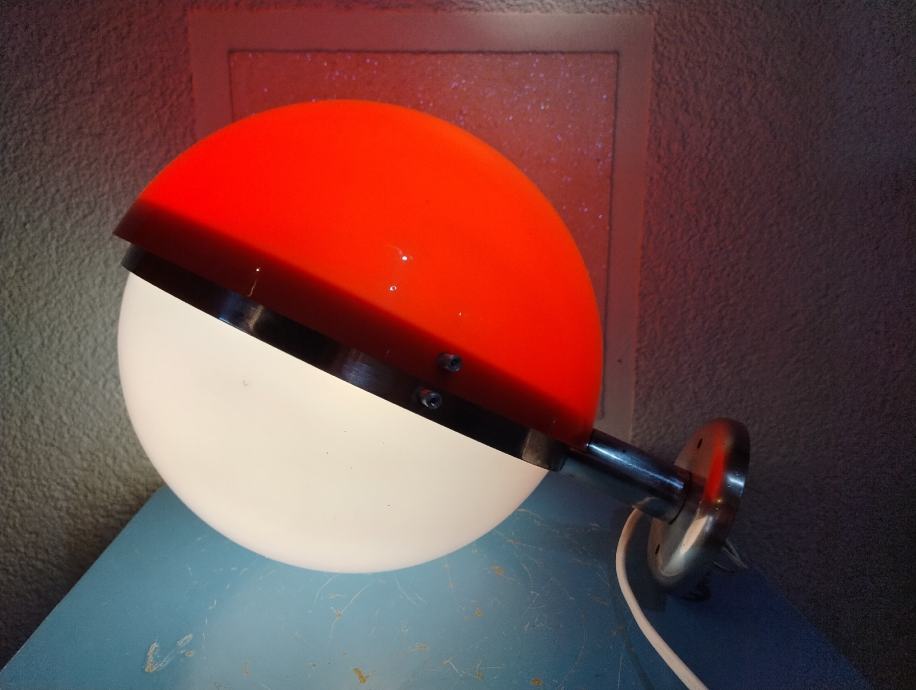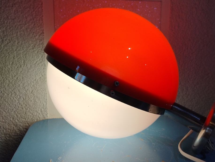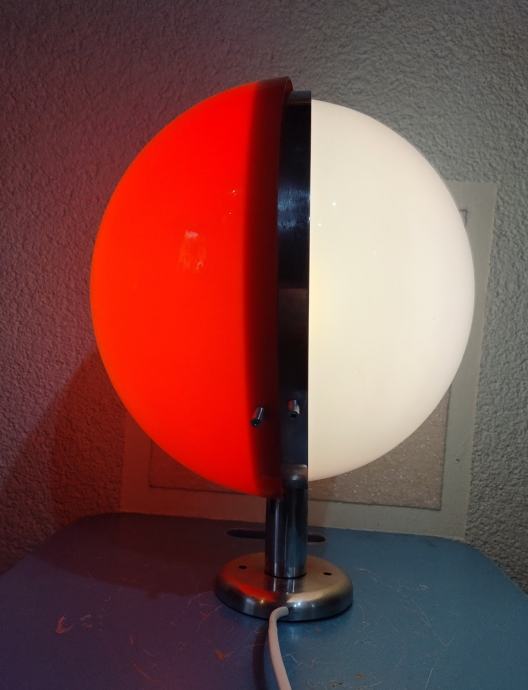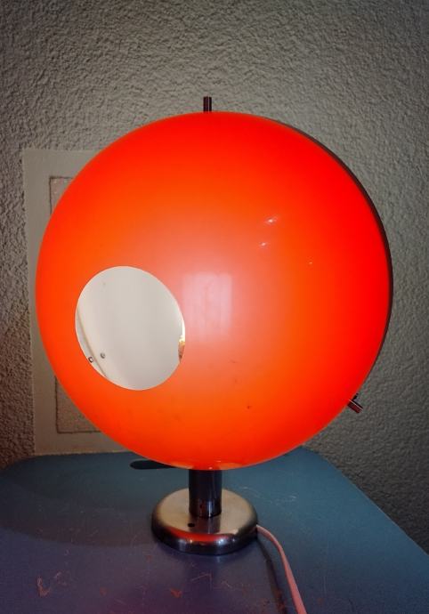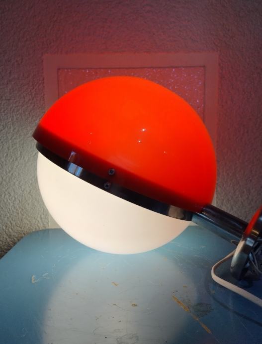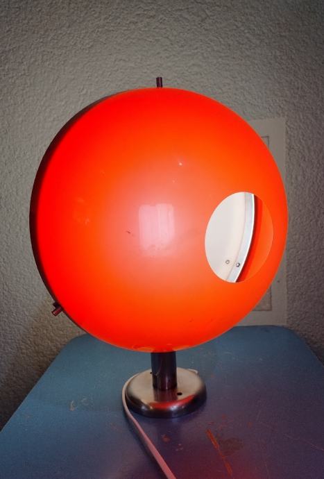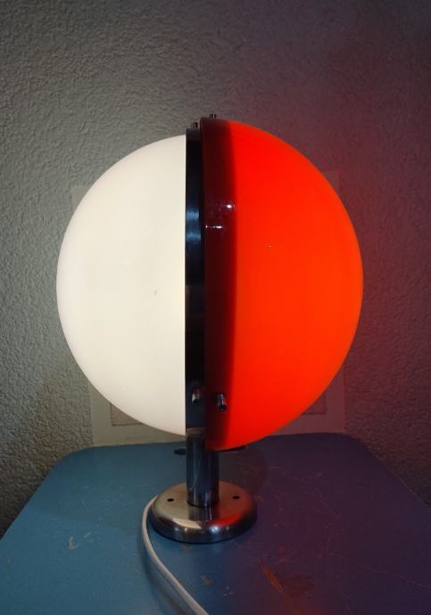 Gornja polovica globusa izrađena je od narančastog plexiglasa, dok je donja od bijelog plexiglasa. Odvojivi kromirani metalni prsten odvaja dvije polovice. U sredini izvor svjetlosti za jednu sijalicu. Baza drške je teška i izrađena od kromiranog metala.