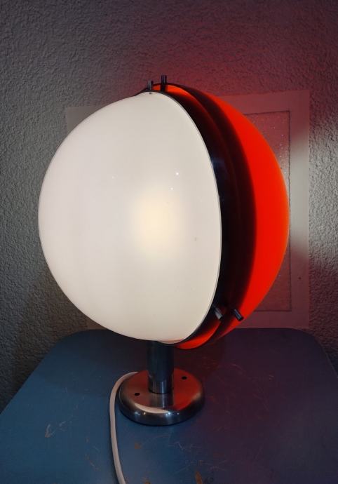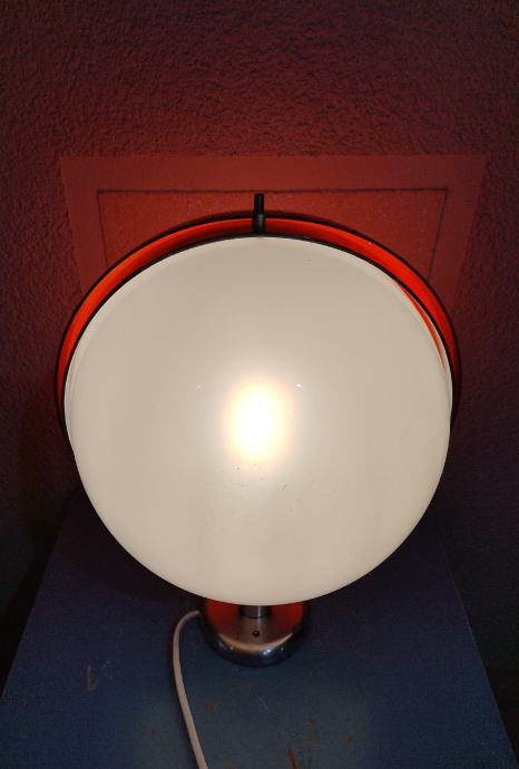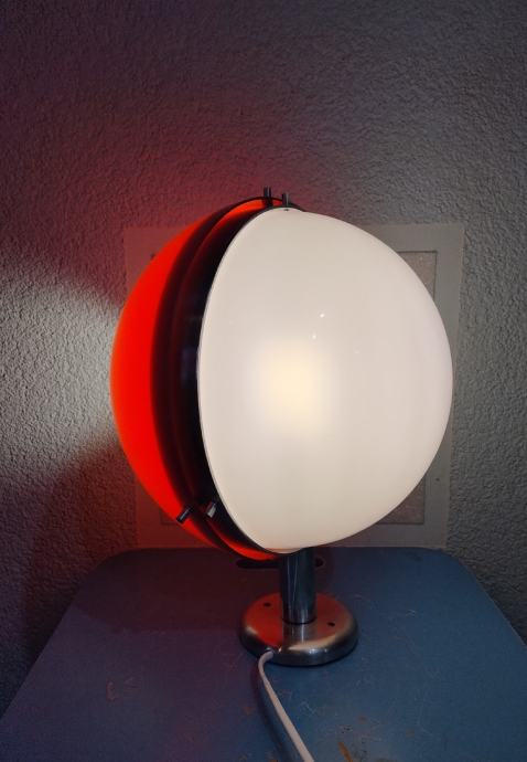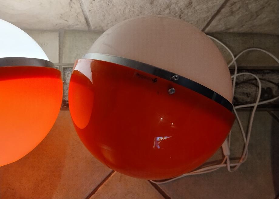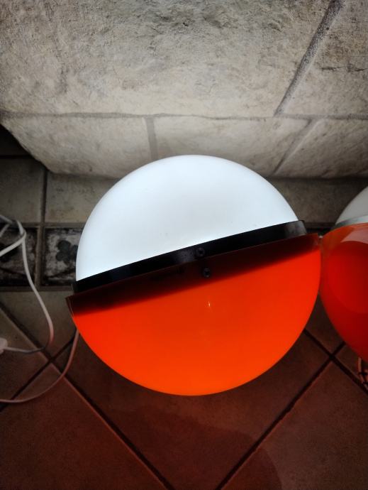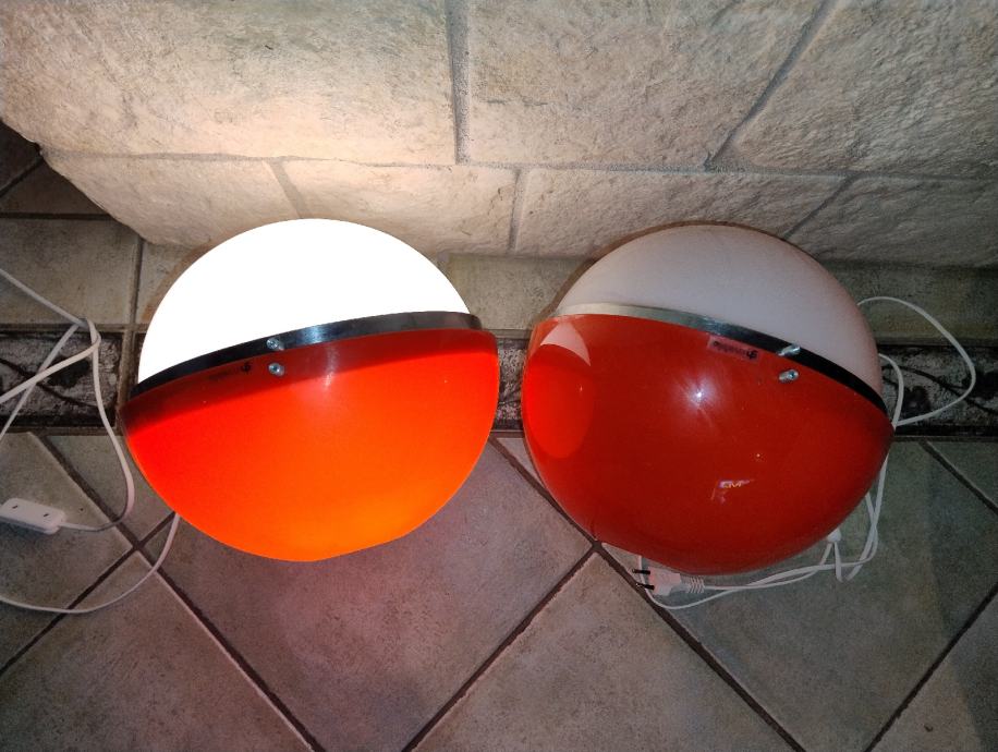 Komplet od 2 velike zidne svjetiljke u stilu space age izrađene u Meblo za Guzzini iz 1970-tih godina. Materijal: plexiglas,kromirani metal . Mogućnost direktnog spajanja na struju, te može biti zidna ili stropna svjetiljka. Ugrađen novi kabel od 3 m sa prekidačem.