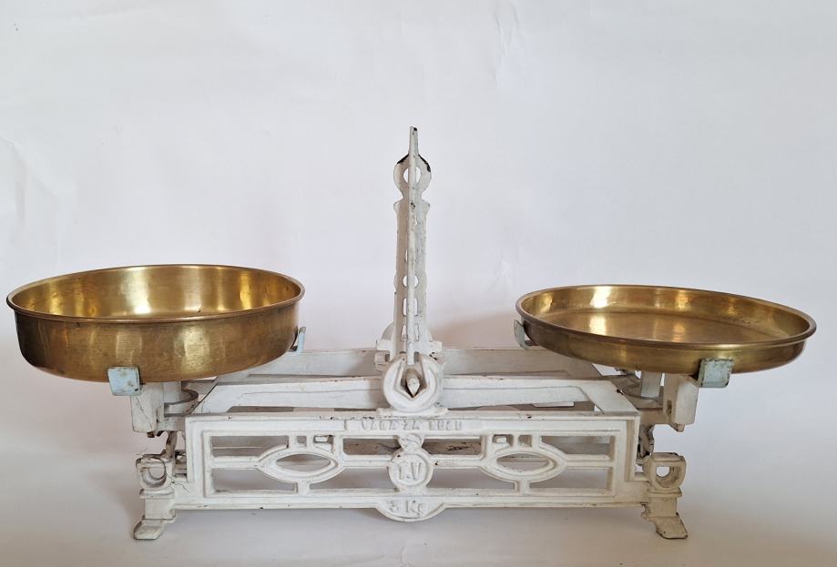 Vintage kuhinjska vaga od bijelog lijevanog željeza s mjedenim pločama.