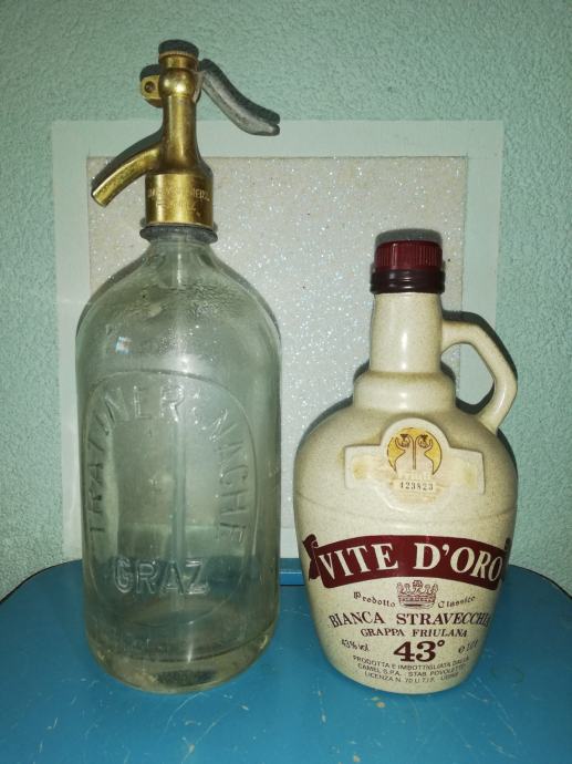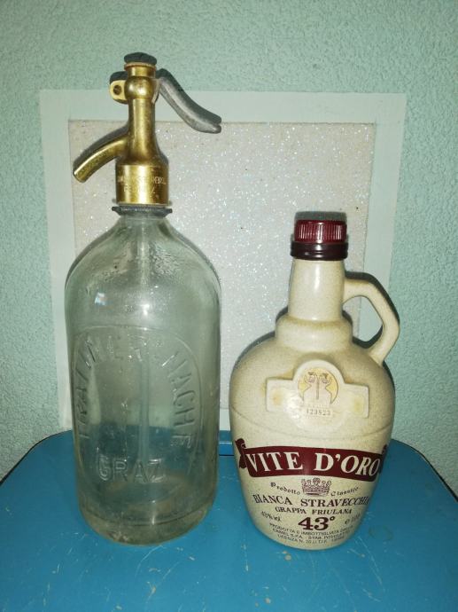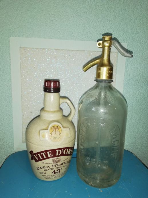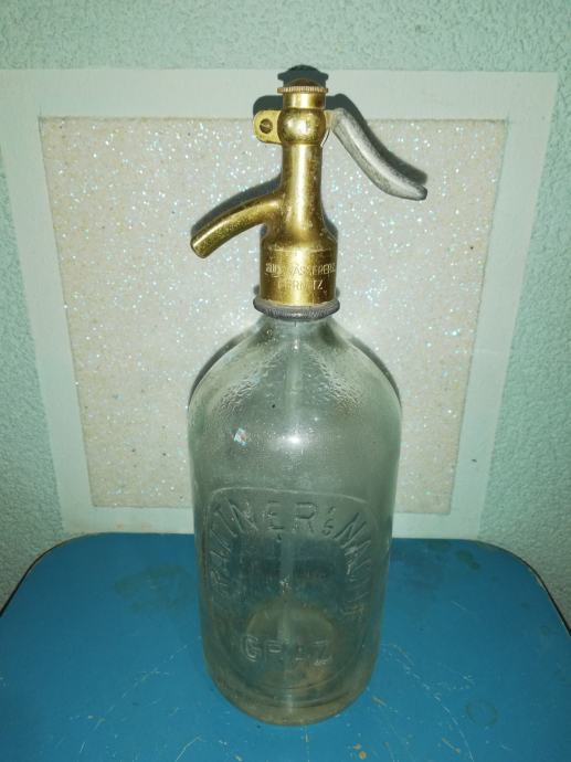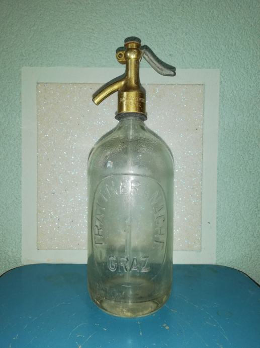 Vintage lot za dekoraciju: soda sifon za reljefnom oznakom TRATTNER 's NACHF,GRAZ na sifonskom čepu Fernitz, neoštećena, visina 32,5 cm, podrijetlo Austrija.