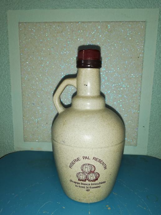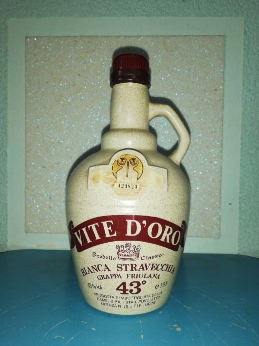 Porculanska boca za Grappu, sa natpisom VITE D' ORO, Bianca Stravecchia, Udine, visina 22,5 cm. Neoštećena.