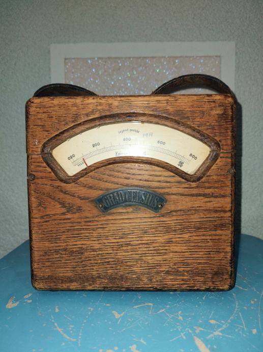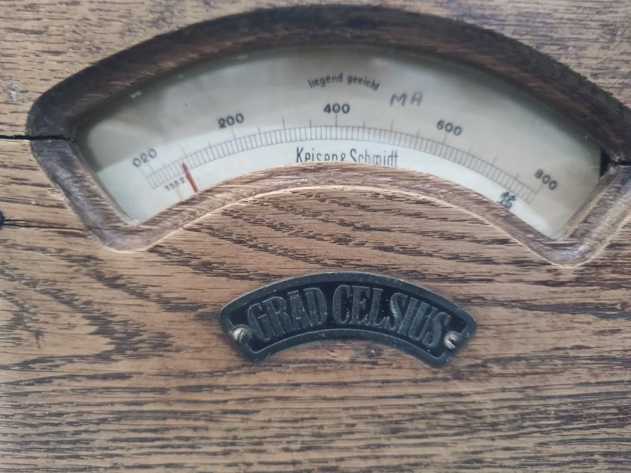 Vintage mjerni uređaj proizvođača Kaiser & Schmidt model Grad Celsius u drvenom kućištu. Dimenzije: visina (18,0 cm) 20,0 cm, širina (19,0 cm) 20,2 cm, dubina 10 cm .