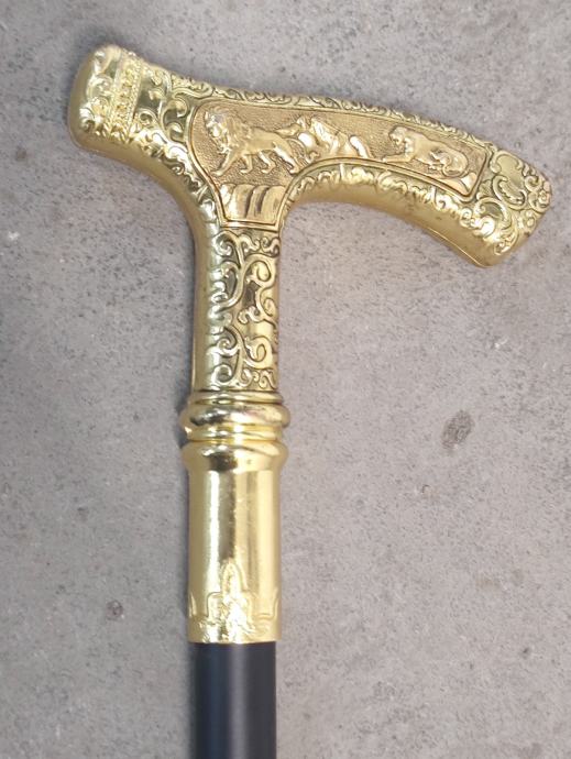 Vintage muški dvodijelni štap za hodanje, sa mesinganom drškom sa reljefima lava i lavice. Dimenzije: 41,5 + 46,0 cm, drška 14 x13 cm