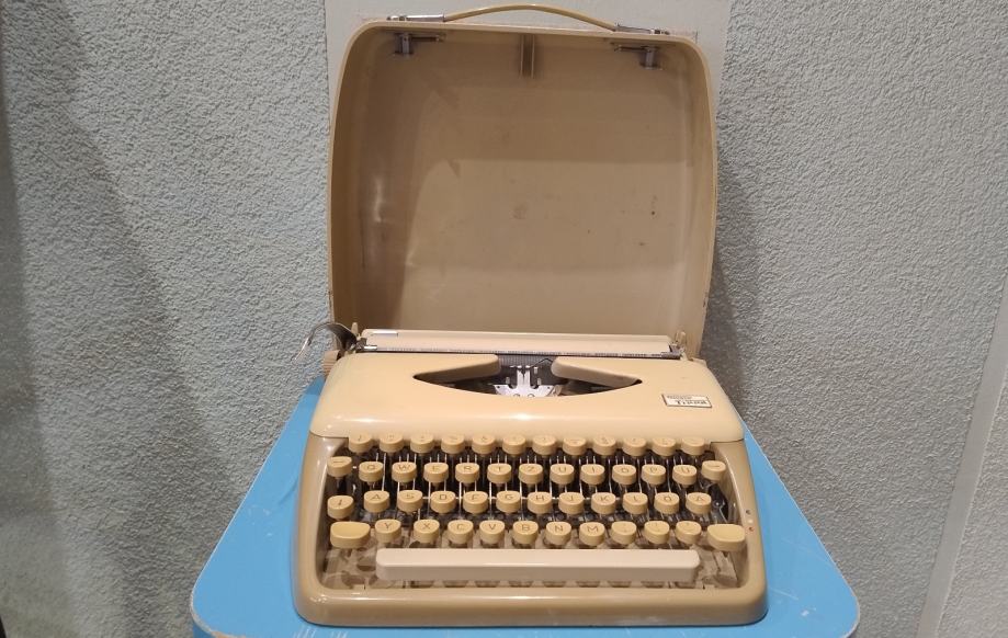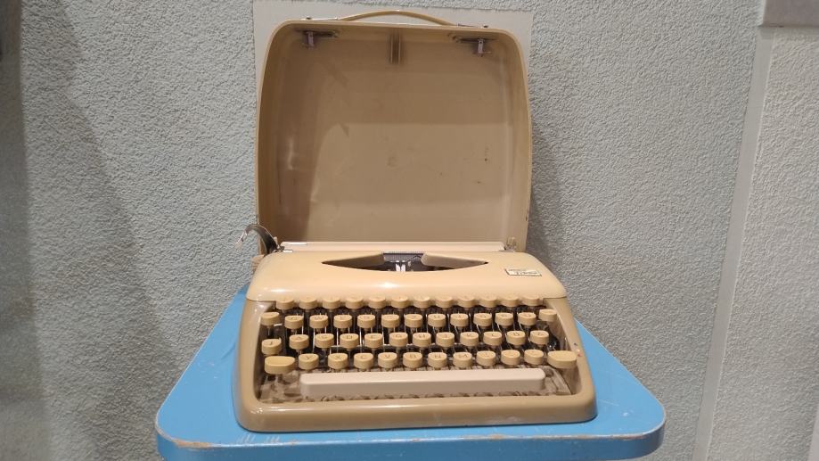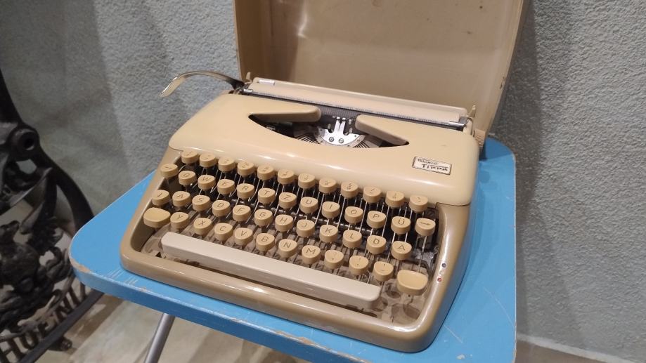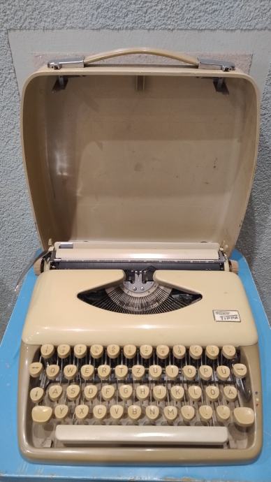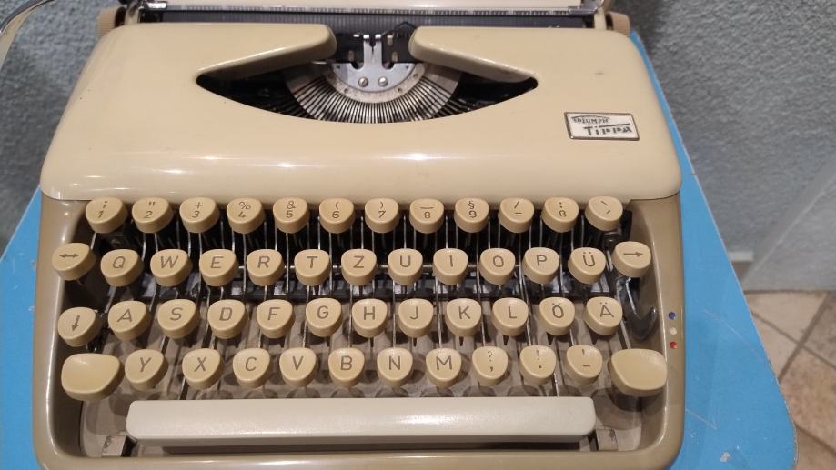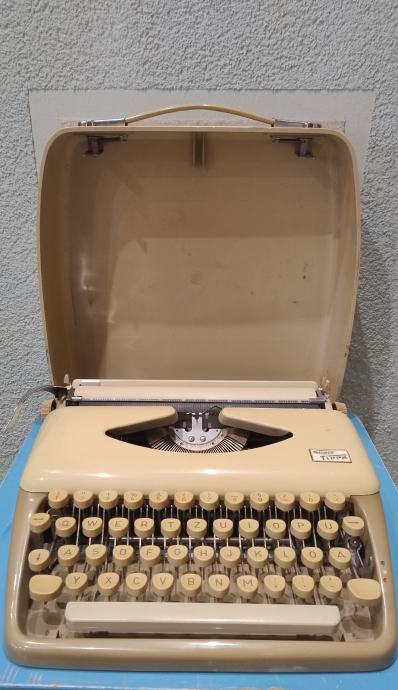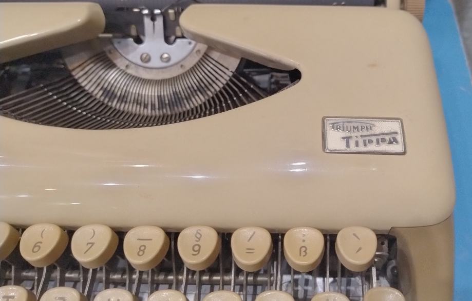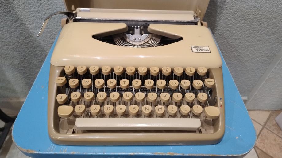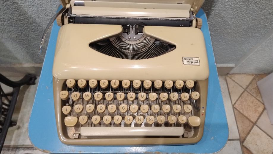Vintage pisaći stroj Triumph Tippa 1 iz 1966.g. Kućište je izrađeno od plastike, pa mu je shodno tome i mala težina. Mali pisaći stroj koji svojim ravnim i laganim dizajnom pomalo podsjeća na "Hermes Baby". Nije visok ni 6 cm, a težak je manje od 4 kg. Idealan i kao prijenosni pisaći stroj.Što se tiče ovog modela, zbog zaobljenog izgleda stječe se dojam da se radi o stroju s metalnim kućištem. Nedostaje mu samo hladnoća metala, inače djeluje robusno poput stroja od metala.I to je upravo ono što jest - robustan. Unatoč plastičnoj vanjštini, ne izgleda jeftino niti krhko. To je mali pisaći stroj čvrst kao kamen koji, kada se pospremi u kofer, stane čak i u ladicu.Uz stroj ide originalno uputstvo.