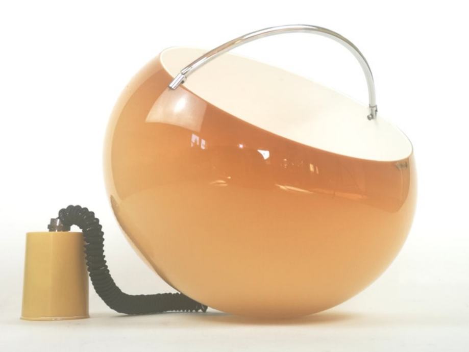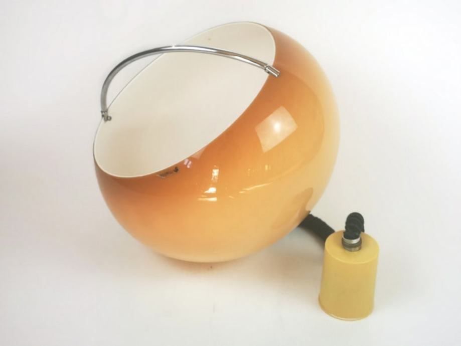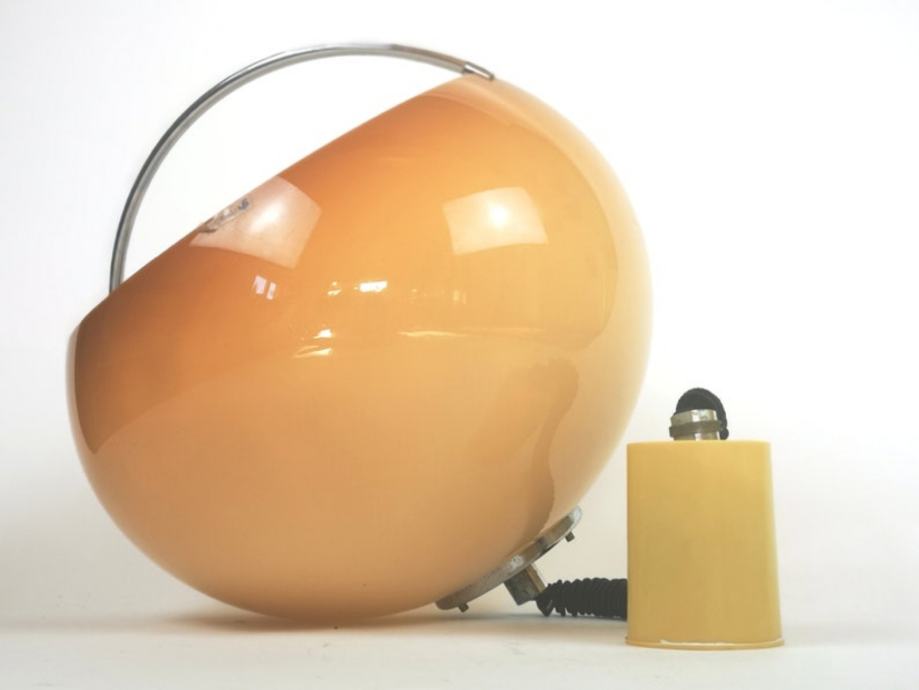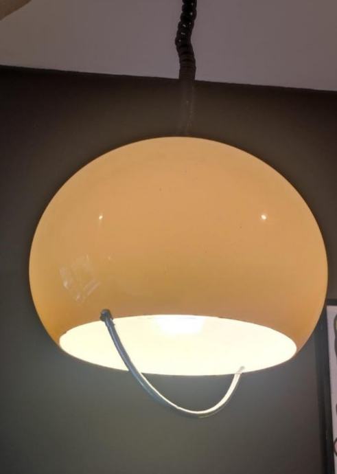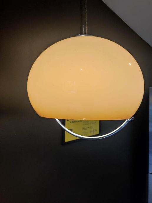 Vintage plafonska svjetiljka sa sjenilom od smeđeg plexiglasa sa metalnim kromiranim grlom. Ovaj model se zove Lucerna. Visina sjenila je podesiva jer visi na rotirajućem rastezljivom nosaču. Kada je upaljena, daje prekrasno, meko i umirujuće svjetlo. Njezin retro atomski izgled i prekrasno ambijentalno svjetlo razlozi su zašto su ove lampe i dalje vrlo tražene. Proizvela ju je tvrtka Meblo/Jugoslavija, kao dio Guzzini kolekcije, talijanskog proizvođača rasvjete poznatog po svojim atomskim i svemirskim dizajnima rasvjete iz 60-ih i 70-ih. Stanje: sačuvano, neoštećeno i funkcionalno vintage stanje. Dimenzije: promjer: 36 cm, visina kada kabel nije produžen: 63 cm.