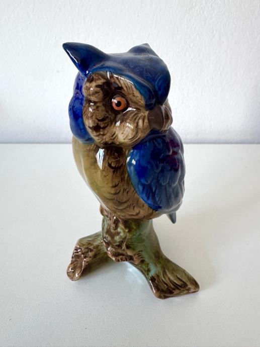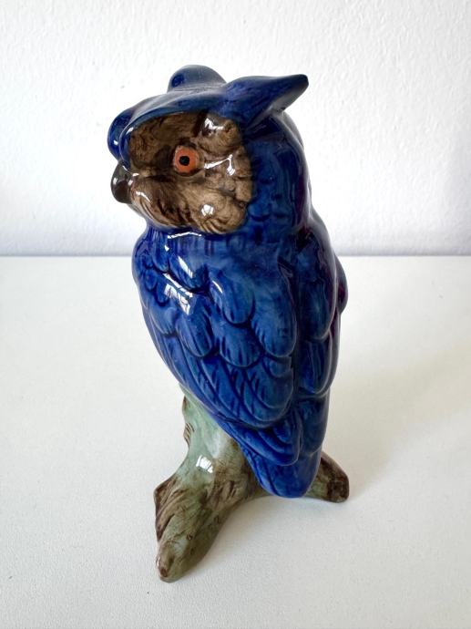 Figura je kvalitetno modelirana, s izraženim detaljima perja i bogatom glazurom u plavim i zemljanim tonovima. Klasičan motiv sove na panju/grani, vrlo dekorativan komad.