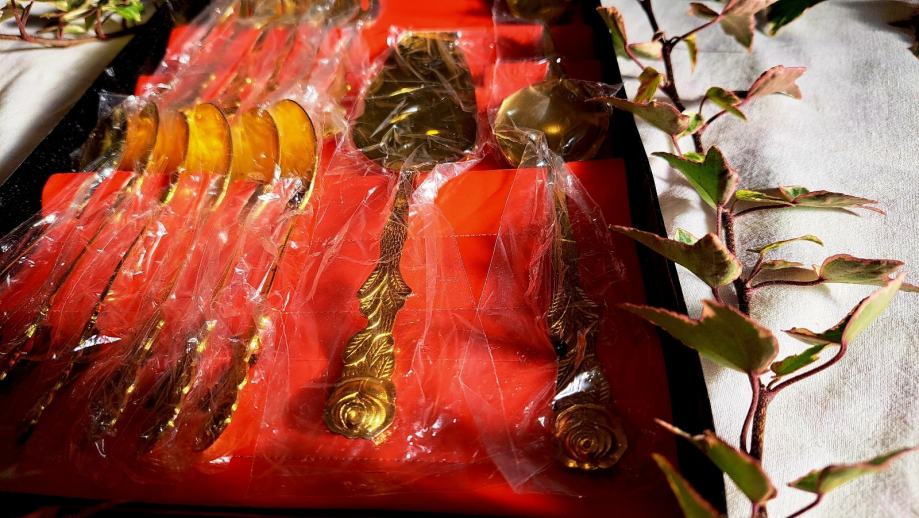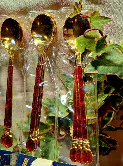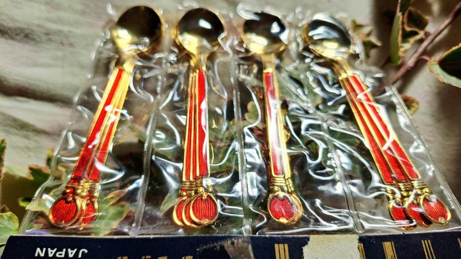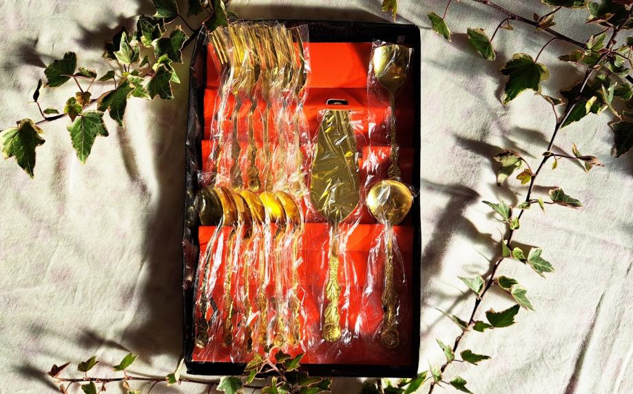 Originalno pakiranje, nikada korišteno. Na dvije žličice vidljiva mikrooksidacija metala ispod pozlate. Sve ostalo u izvrsnom stanju, nije otvarano iz originalnog pakiranja.