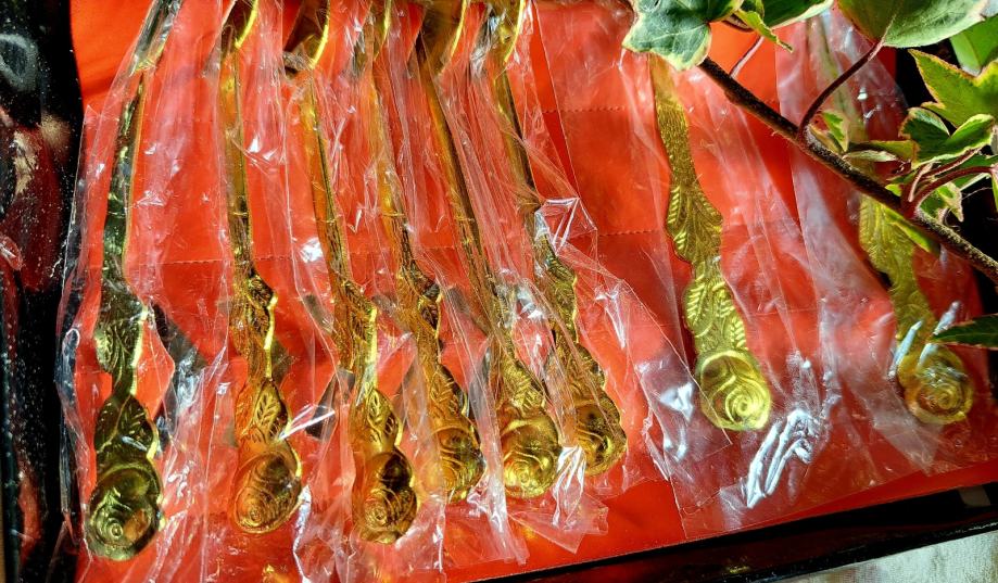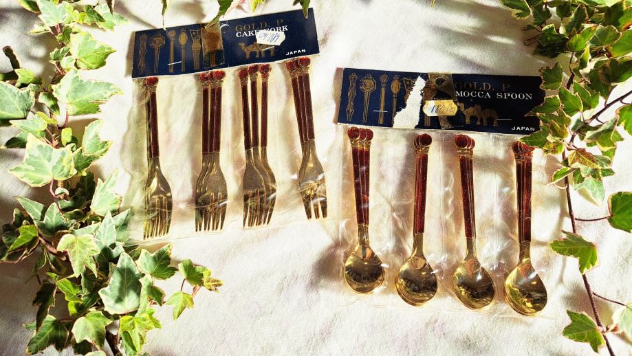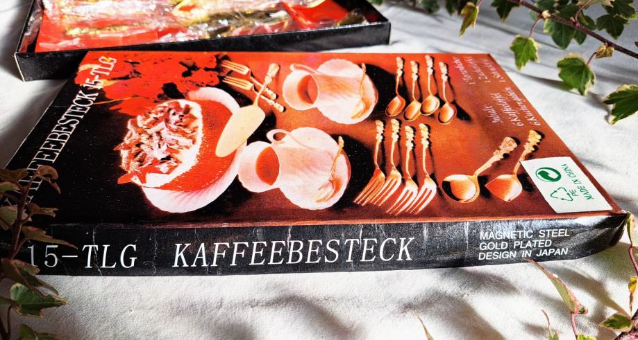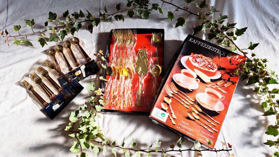 Prodajem vintage dva pozlaćena seta pribora za kavu i kolače, u originalnom pakiranju, nikada korišteni. Setovi su Japan/Kina, magnetic steel, gold plated, kupljeni krajem 80-ih, početkom 90-ih.