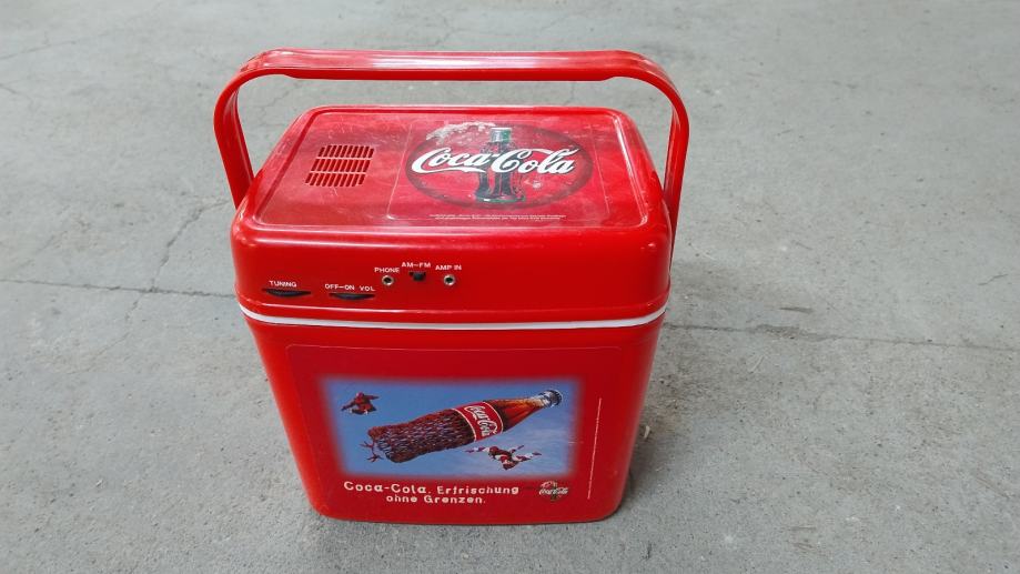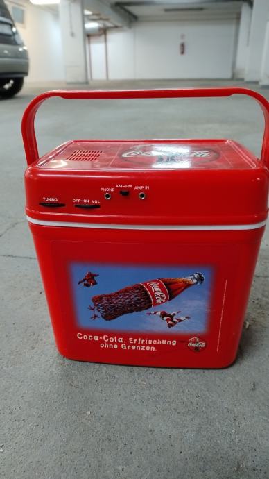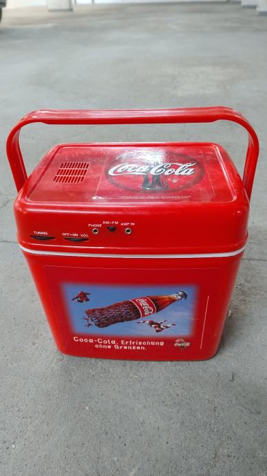Prijenosni hladnjak marke Coca Cola. U poklopcu ima radio koji radi na AA baterije standardne veličine. Radio radi iako se ne čuju sve frekvencije AM/FM. U savršenom je stanju. Mjere (širina x dubina x visina) 25x19x29 cm