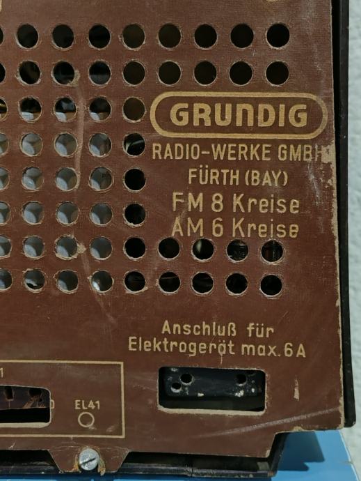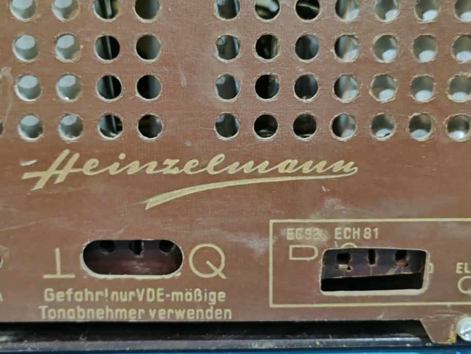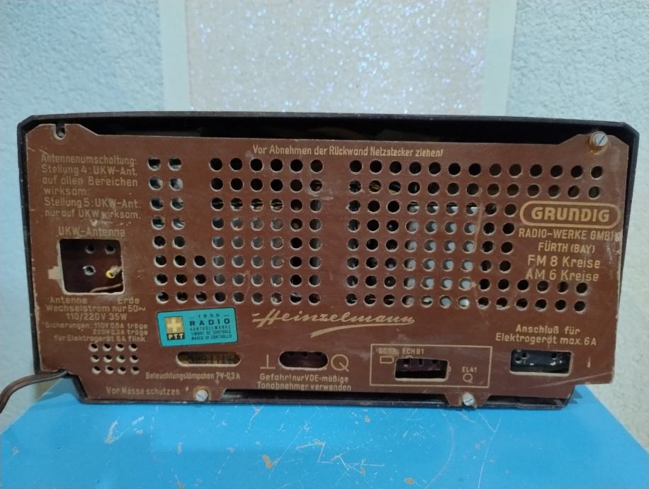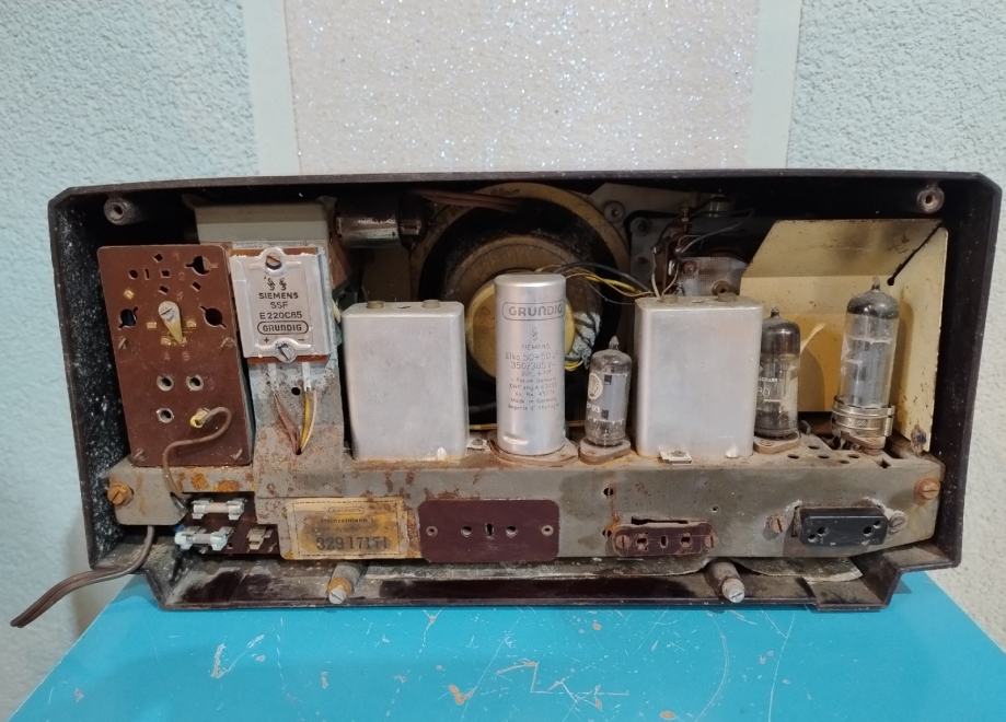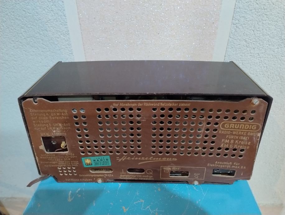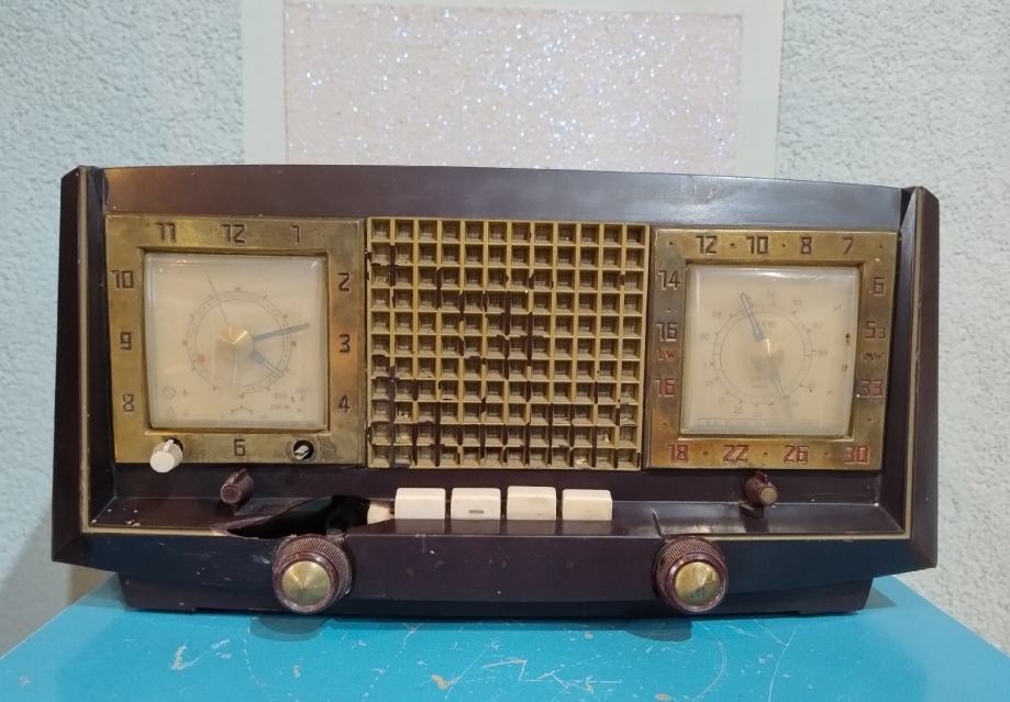 Vintage radio Grunding, model Heinzelman iz 1955.g. Obliik: Stolni model sa satom ((Alarm) Clock Radio). Dimenzije (WHD): 368 x 180 x 175 mm / 14,5 x 7,1 x 6,9 inča.