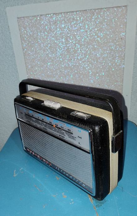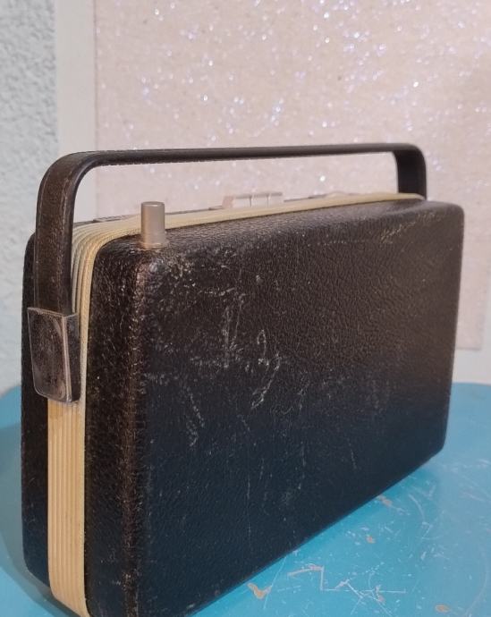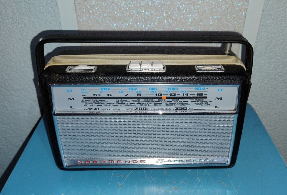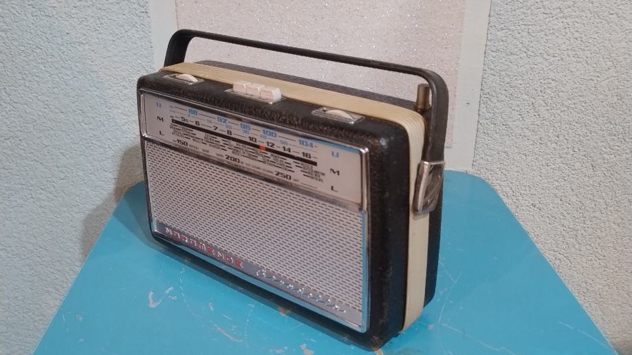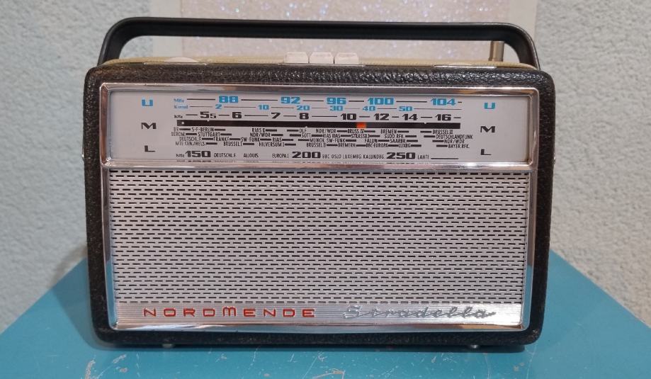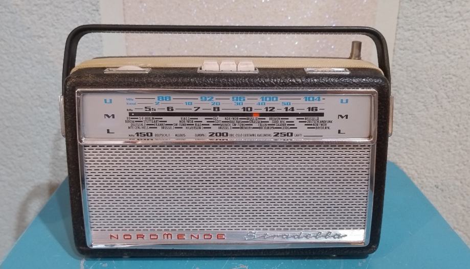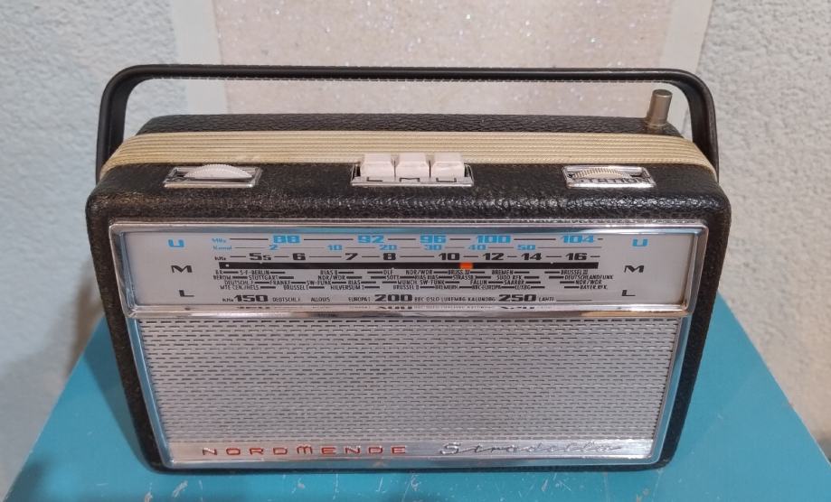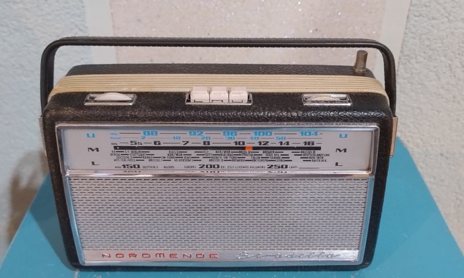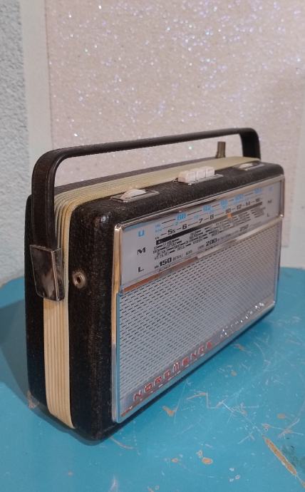 Vintage radio tranzistor Nordmende, model Proizvođač: Nordmende, Njemačka, god. Proizv. 1964./65. g.Materijal: Koža / plastika .Dimenzije (WHD): 237 x 144 x 70 mm . Težina 1,5 kg.