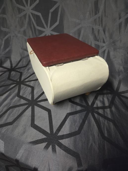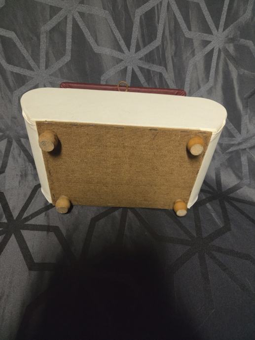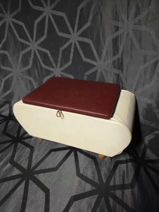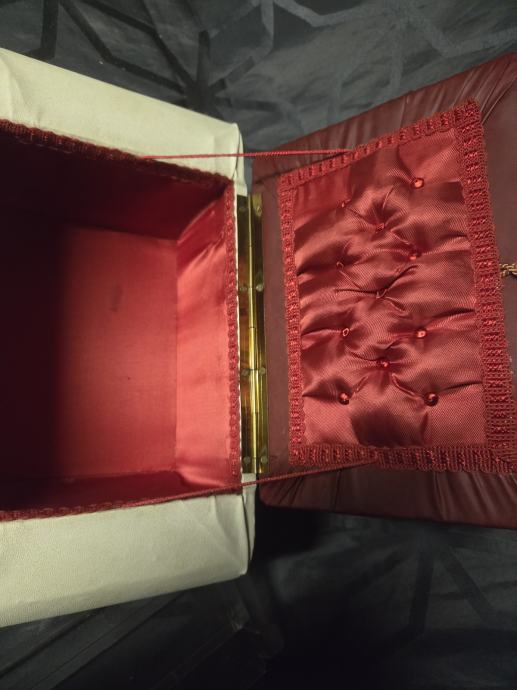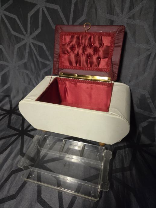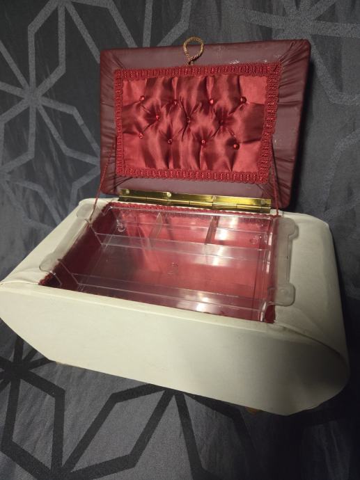 U izuzetnom stanju bez oštećenja. Presvuceno vinil tkaninom ,unutraš njost presvucena jarko crvenim satenom. Predmet je služio u tom periodu za pohranu sitnica. Made in W.Germany. dimenzije 36/19/17 cm.