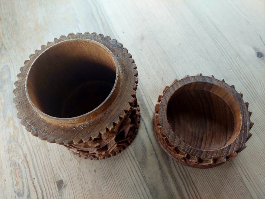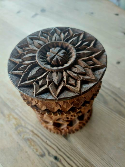 Vintage rezbarena kutilja sa reljefnim ukrasima,rucni rad.Visine 13cm promjer 10cm