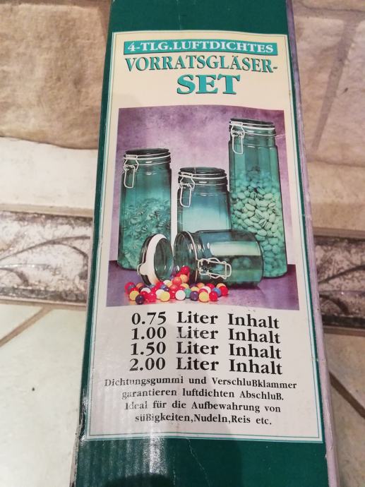 Set od 4 vintage posude od smaragdno - zelenog stakla, 12-straničnih, u originalnoj ambalaži. Posude nisu nikada korištene, što dokazuju naljepnice na dnu svake posude. Posude imaju poklopac sa gumenim vakumskim prstenom, koji sprečava ulazak zraka, i sigurno dugotrajno držanje namirnica. Također imaju žičane šarke za zatvaranje. Veličine: 0,75 ltr, 1,0 ltr., 1,5 ltr., i 2,0 ltr. Za čuvanje agruma, orašastih proizvoda, bombona, tjestenine, blagdanskih kolačića,... Idealno za blagdanski poklon. Stanje, kao novo, nikada nije korišteno.