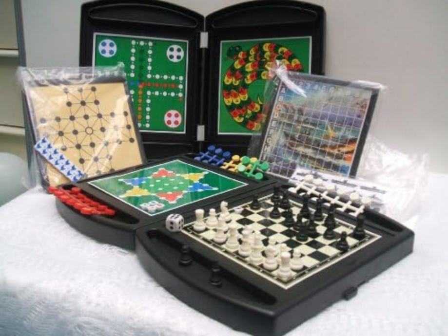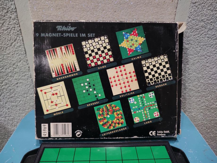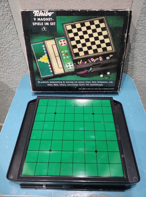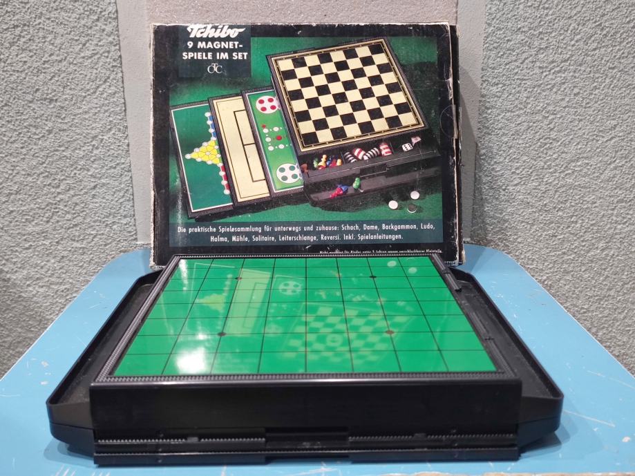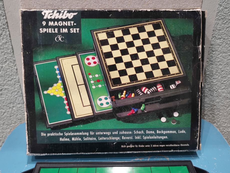 Vintage set društvenih igara Tchibo sa 9 magnetnih igara u setu, koji sadrži klasične društvene igre: Solitaire, Šah, Zmije i ljestve te Ludo.Igre su dizajnirane s magnetnim figurama kako bi ostale na mjestu.Proizvod je izdala tvrtka Tchibo GmbH. Stanje: kao novo, nikada korišteno.