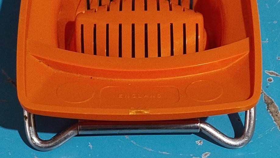 Vintage dizajnerski rezač za kuhana jaja, materijal: nehrđajući čelik, tvrda plastika. podrijetlo: Engleska. Stil: space age. Dimenzije 12,0 x 9,0 x 3,5 cm.