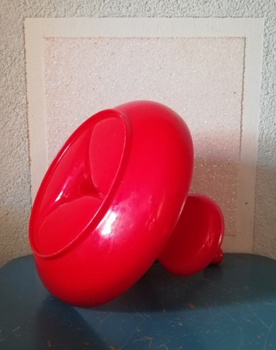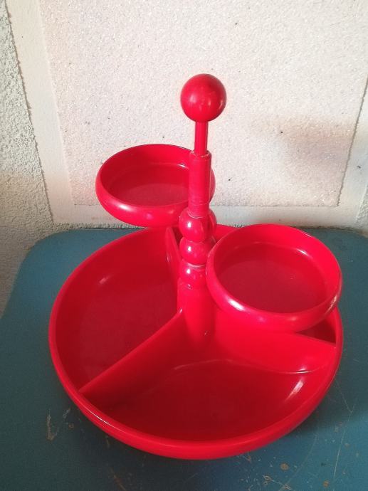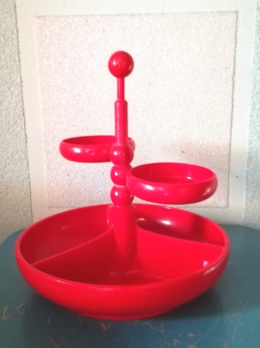 Vintage crveni stalak za grickalice, slastice ili umake tvrtke EMSA Plastik. Materijal:tvrda plastika. Ima veliku donju zdjelu podijeljenu u tri odjeljka i dvije male zdjelice koje se mogu postaviti bilo gdje oko središnje osi.