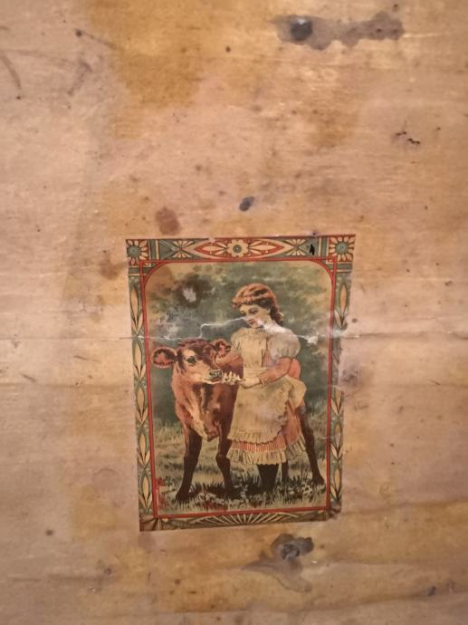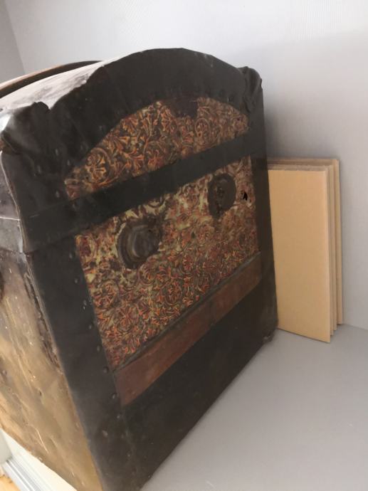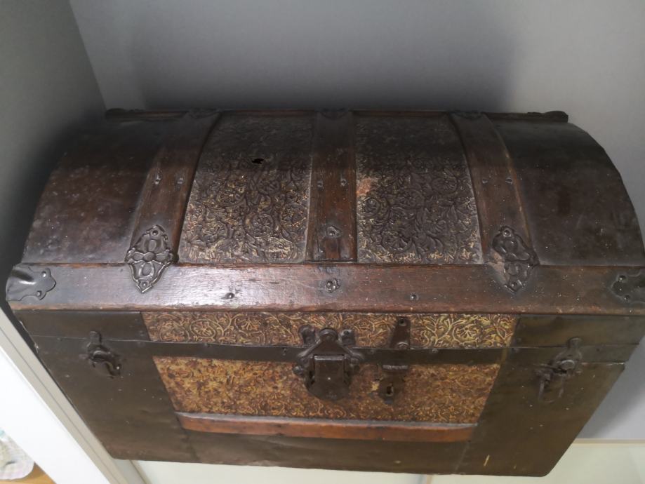 Prodaje se stari drveni sanduk/kovčeg. Ručkice s jedne strane nema, a druge je strane odvojena s jedne strane. Visina 43 cm, dužina 66 cm, dubina 37 cm.