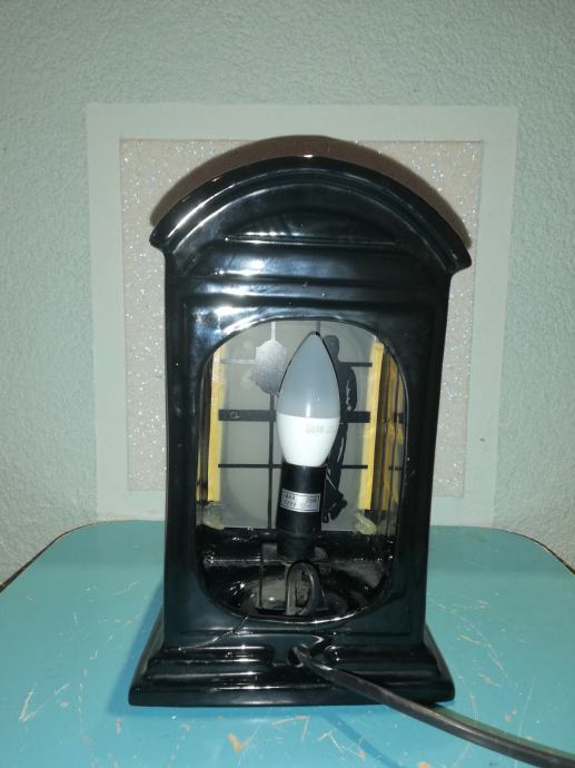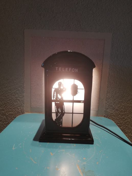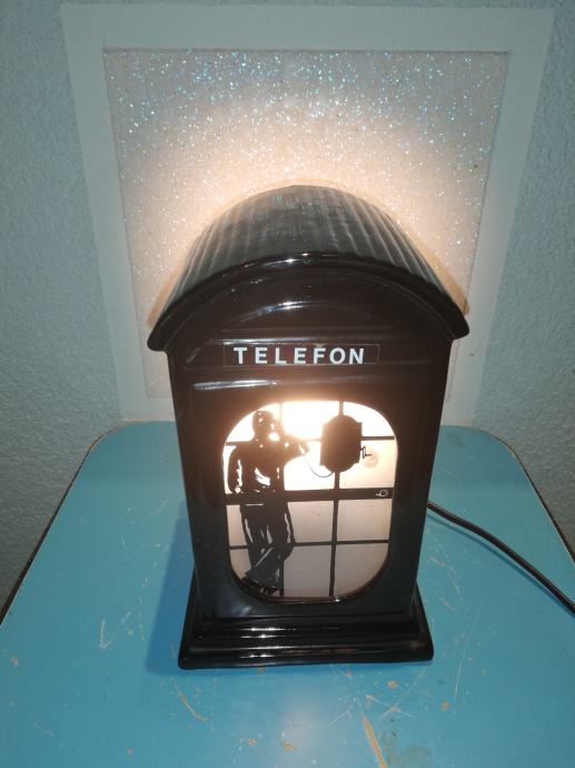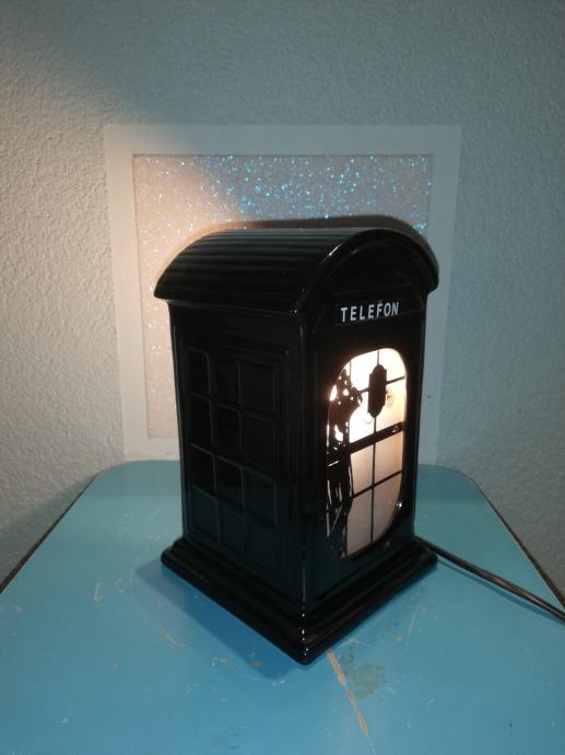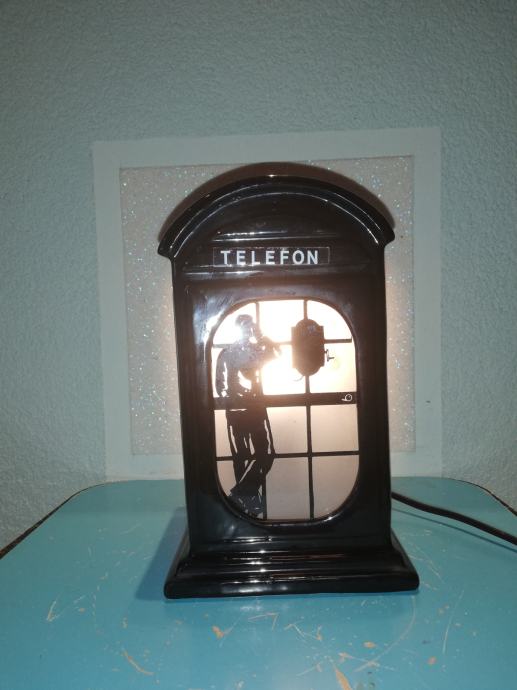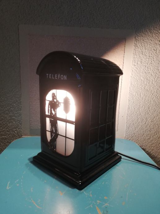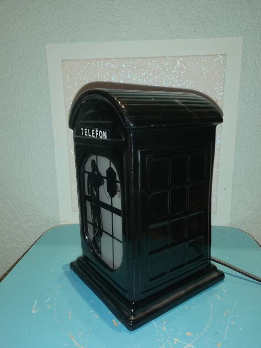 Vintage Stolna svjetiljka, telefonska govornica, crne boje, materijal : porculan, dimenzije : 16 Š x 16 d x 24 v cm. U funkciji, ne korišteno, iz kolekcije. Sa utikačem i prekidačem.