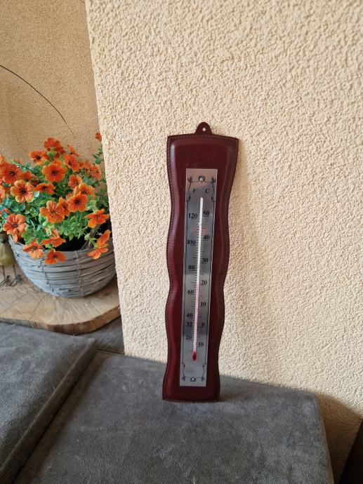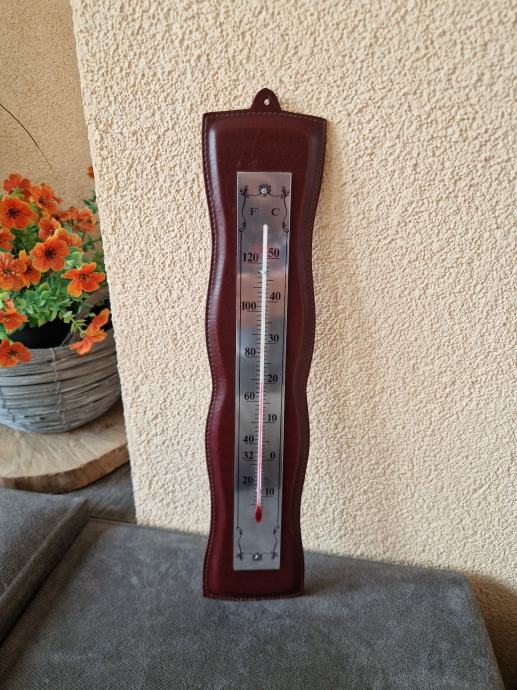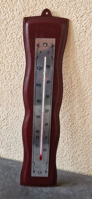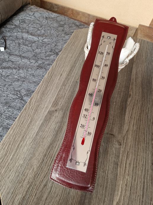 Metalna pločica koja pokazuje sobnu temperaturu na tamnocrvenom kožnom okviru
