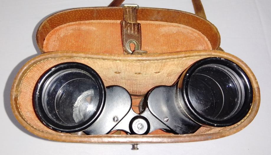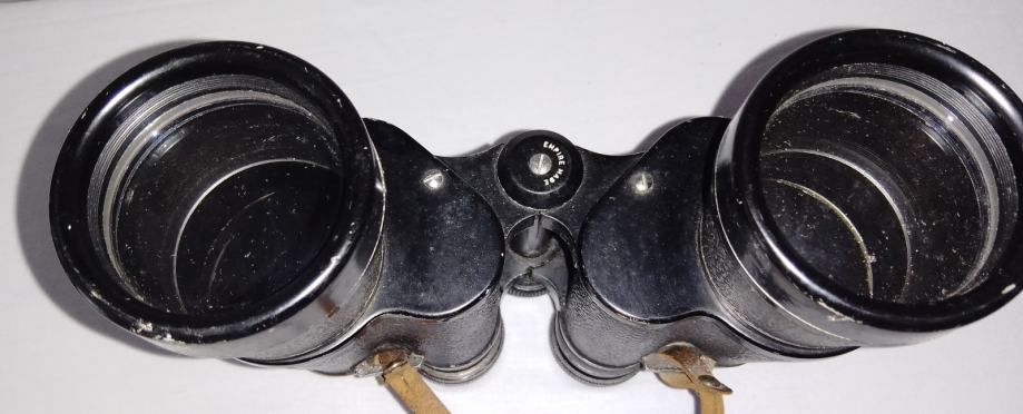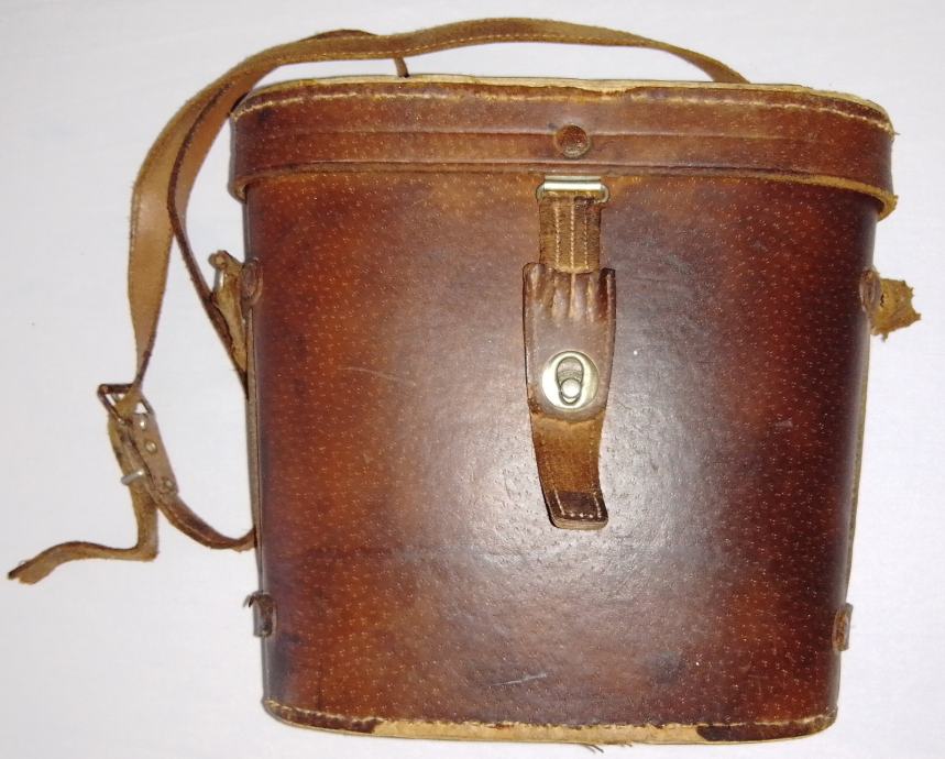 Smeđa kožna futrola i remen imaju znakove habanja, ali dalekozor je u dobrom radnom stanju.