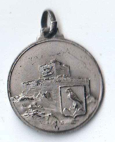 Starinski metalni privjesak kružnog oblika s reljefnim prikazom utvrde / planinskog objekta i heraldičkog štita s pticom.