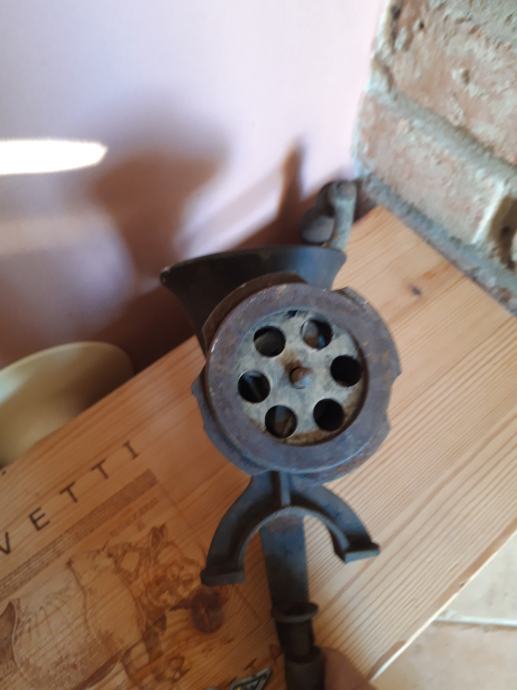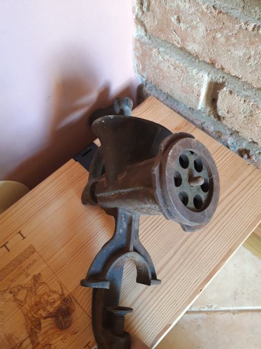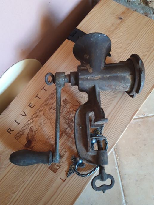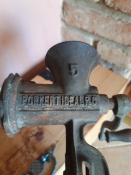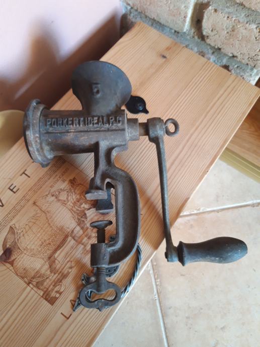 Vrlo stara mašina za meso, stara više od 100 godina, PORKERT IDEAL P&C 5, pronađena je u drvenoj kutiji na tavanu jako stare zgrade. Ispravna je u potpunosti, sve radi. Jako je lijep ukrasni detalj a još ispravan i može poslužiti svrsi. Prodajem ju za 20 eura. Mob 095 573 5601