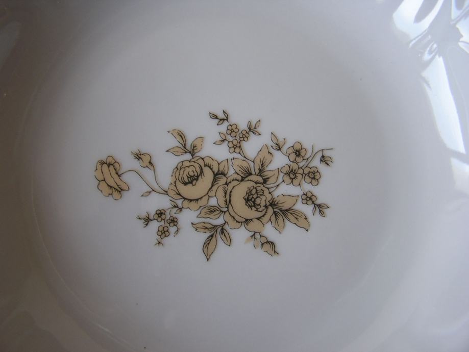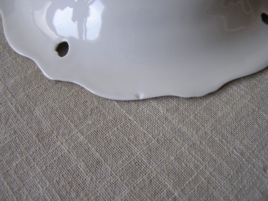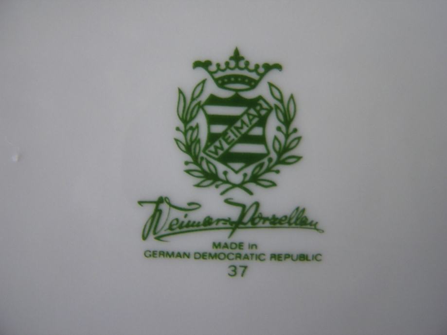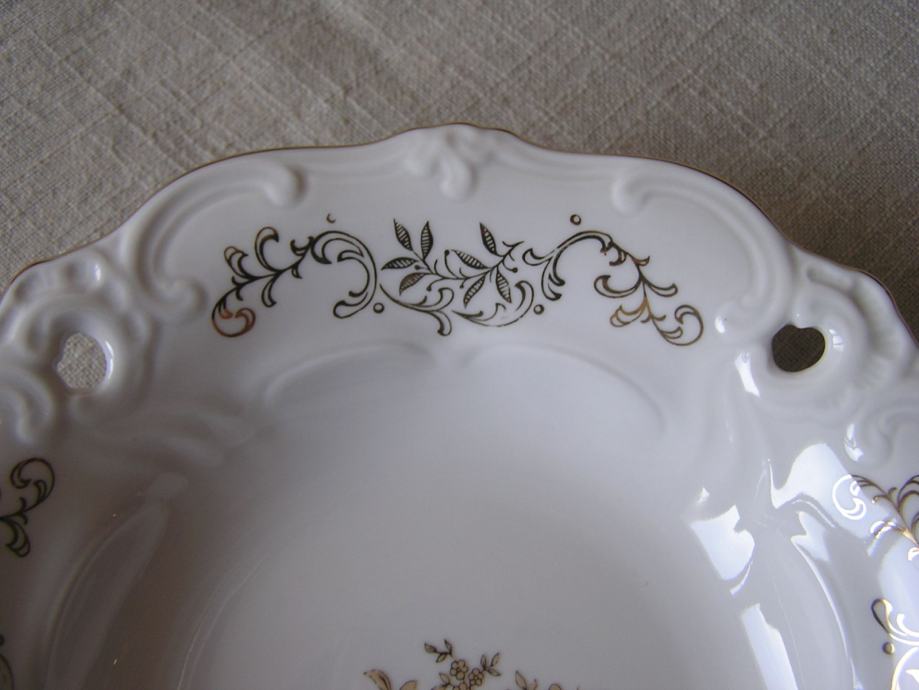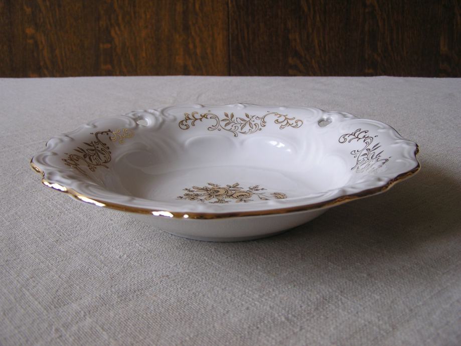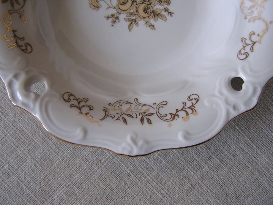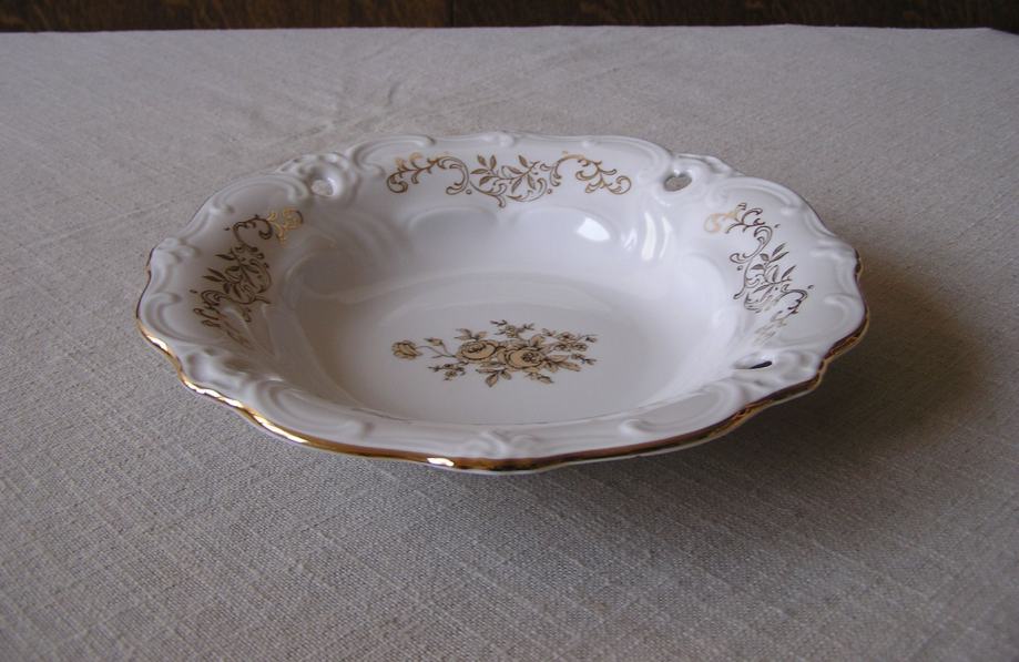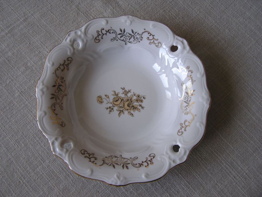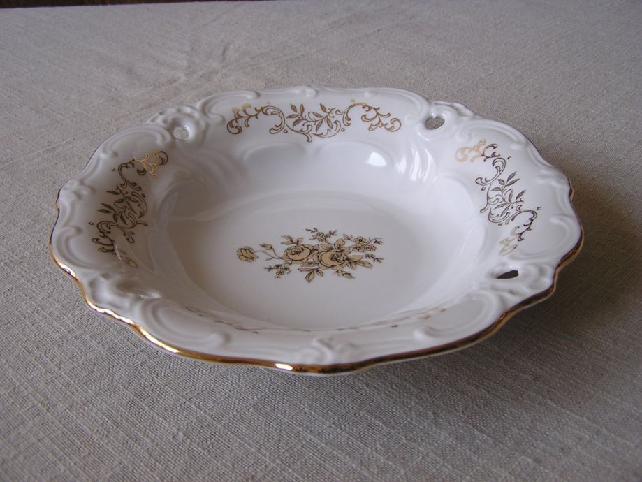 Okrugla porculanska zdjelica u boji svjetle slonovače, valovitog ruba sa reljefnim detaljima uz rub, zlatnim ornamentima i buketom zlatnih ruža u sredini. Njemački Weimar, prema žigu iz perioda 1980. - 1990. Ima jedno oštećenje sa stražnje strane ispod gornjeg ruba (zadnja slika), s prednje strane nije vidljivo. Sve ostalo je u odličnom stanju.