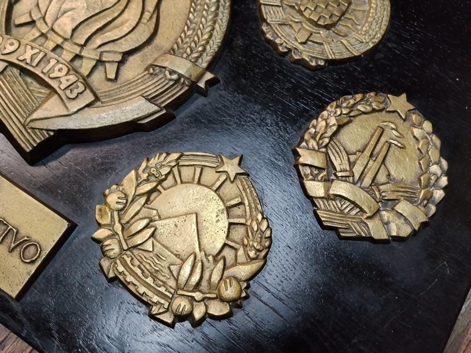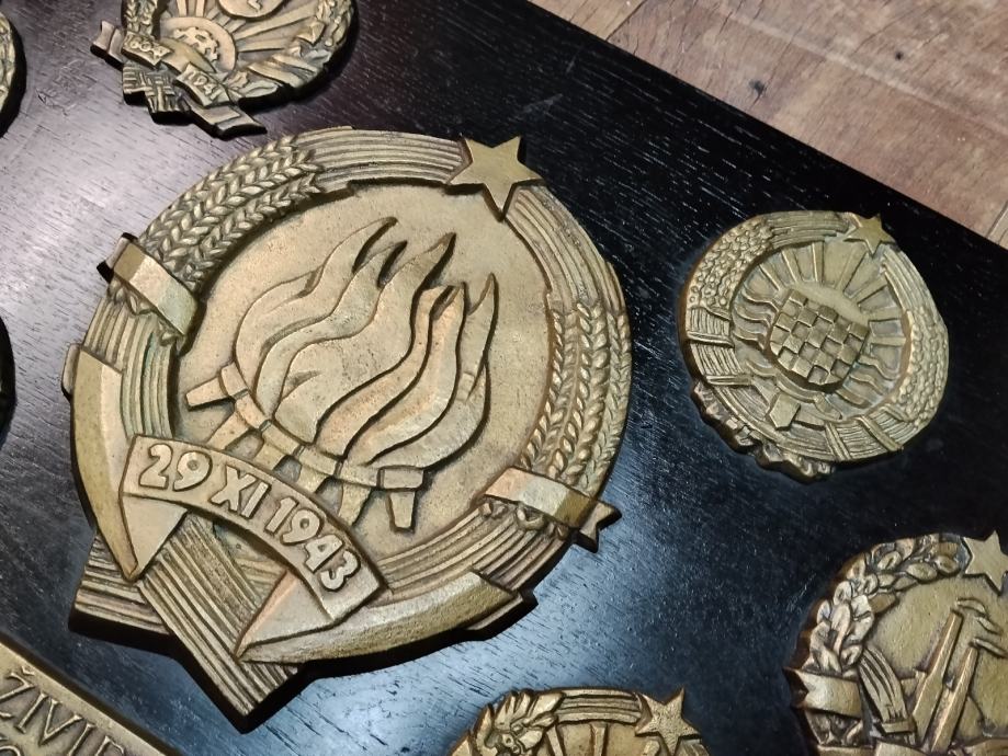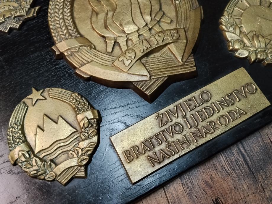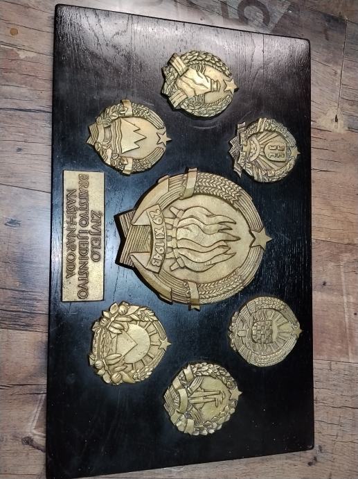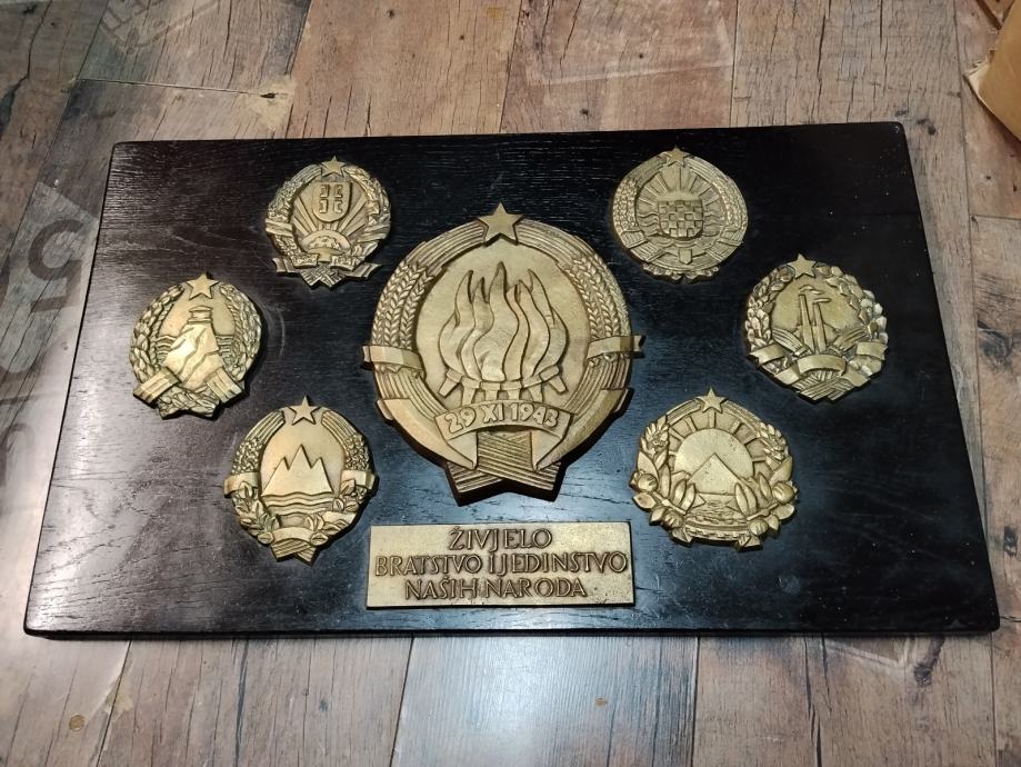 Mesingani grb Jugoslavije sa grbovima svih republika na drvenom nosaču dimenzija 65cm x 40cm