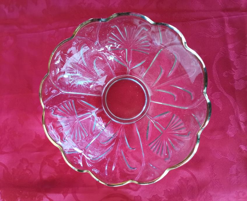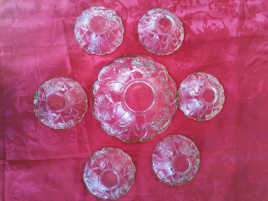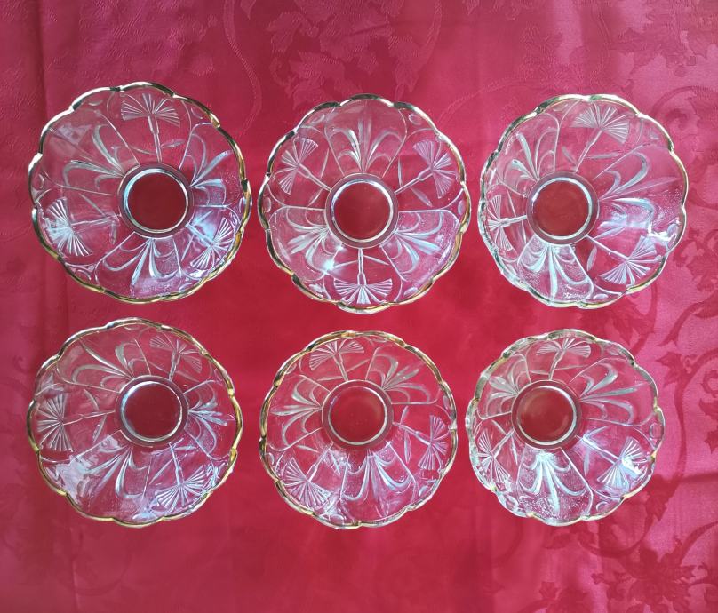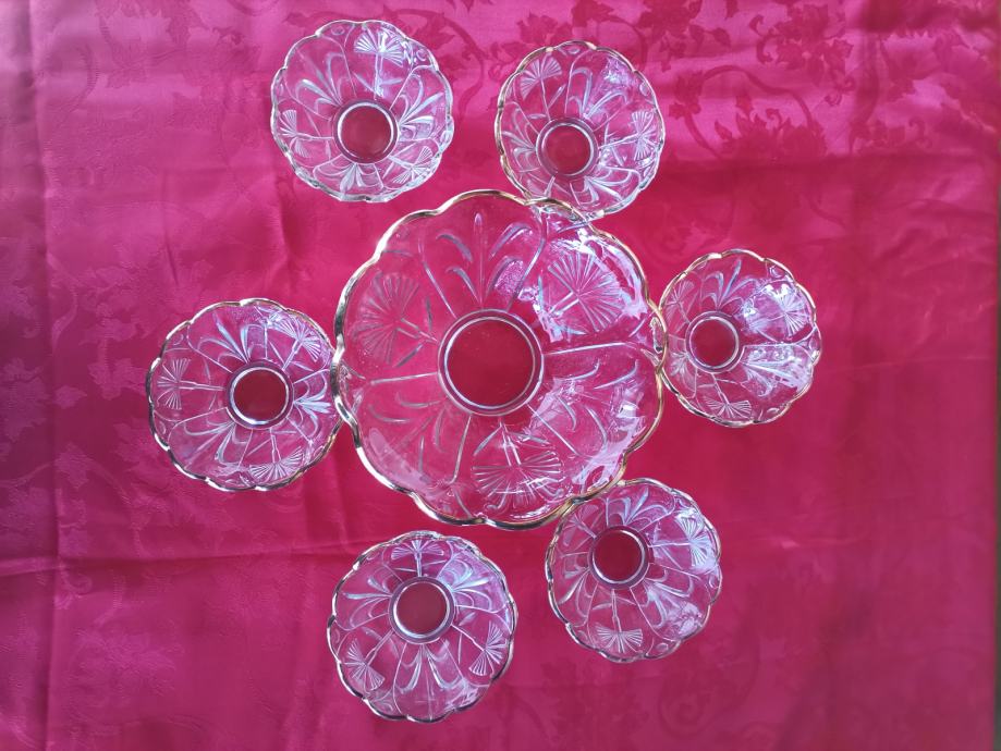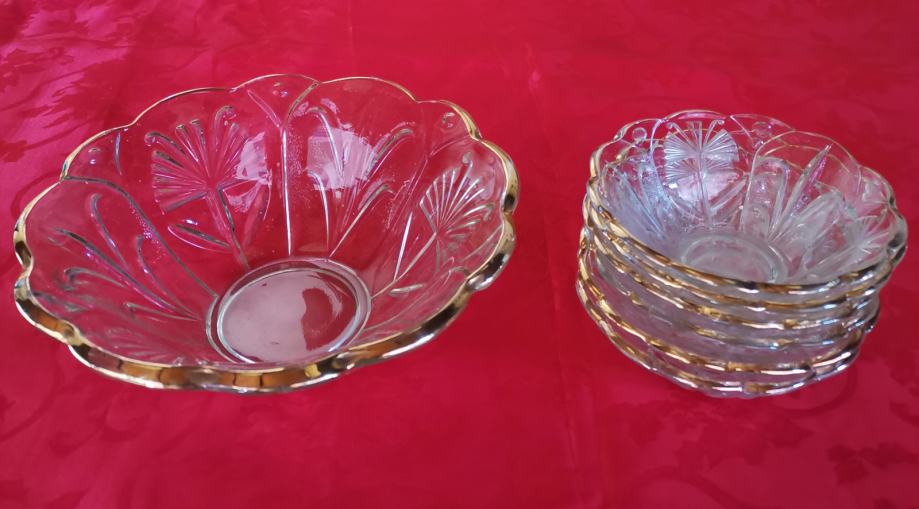 Prekrasna staklena zdjela s pozlaćenim rubom i šest zdjelica u kompletu, vintage